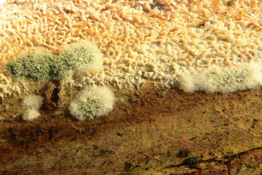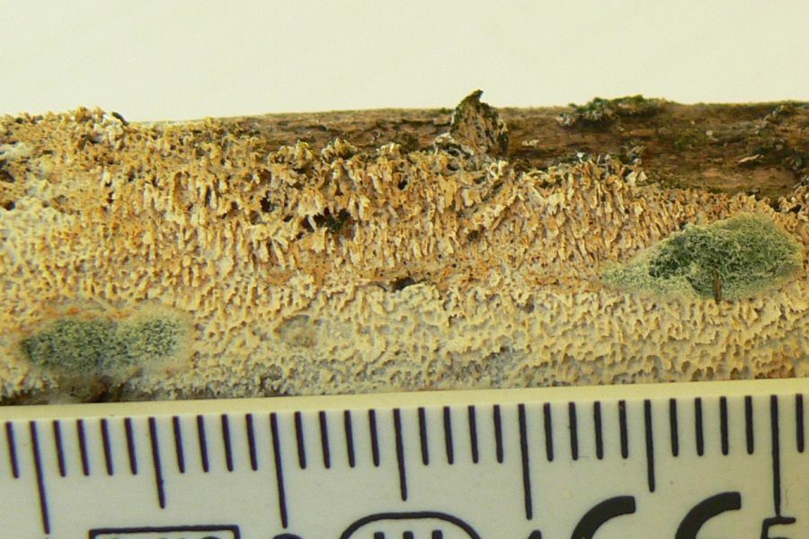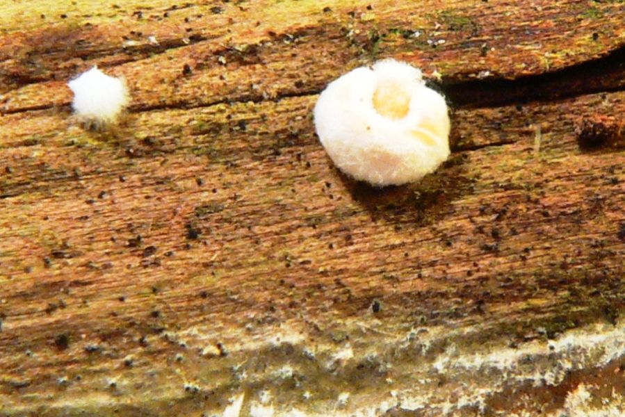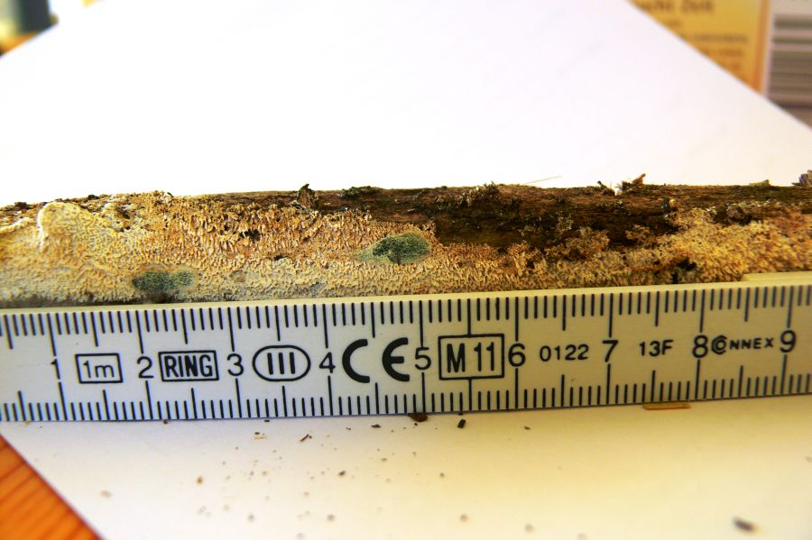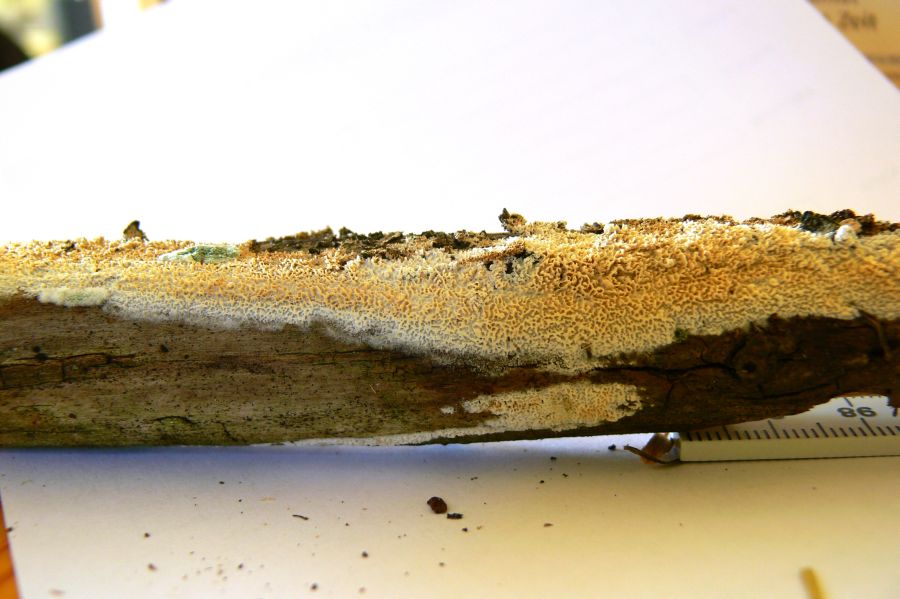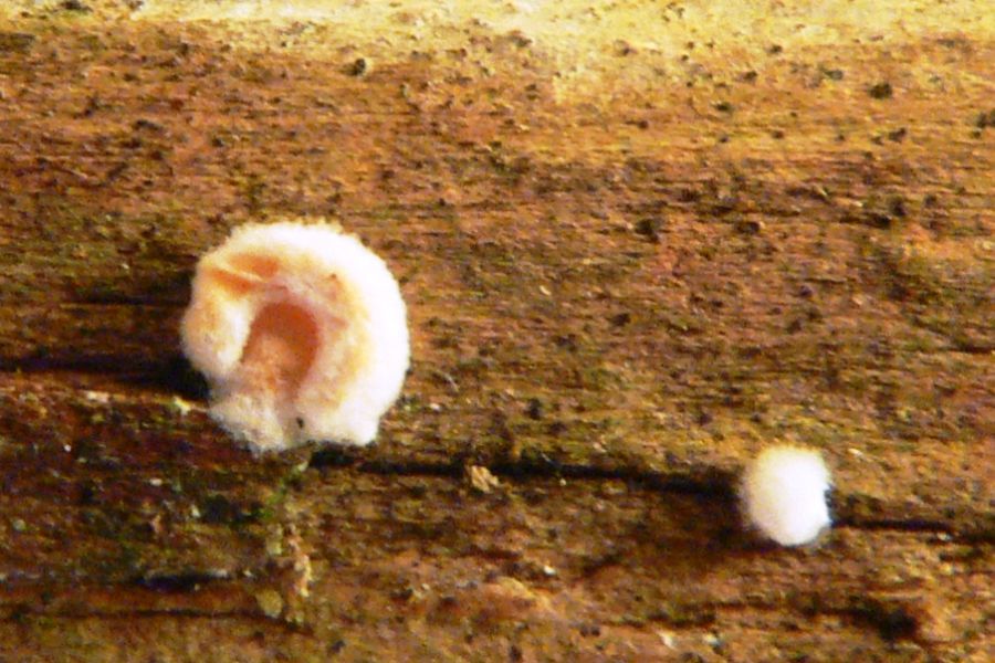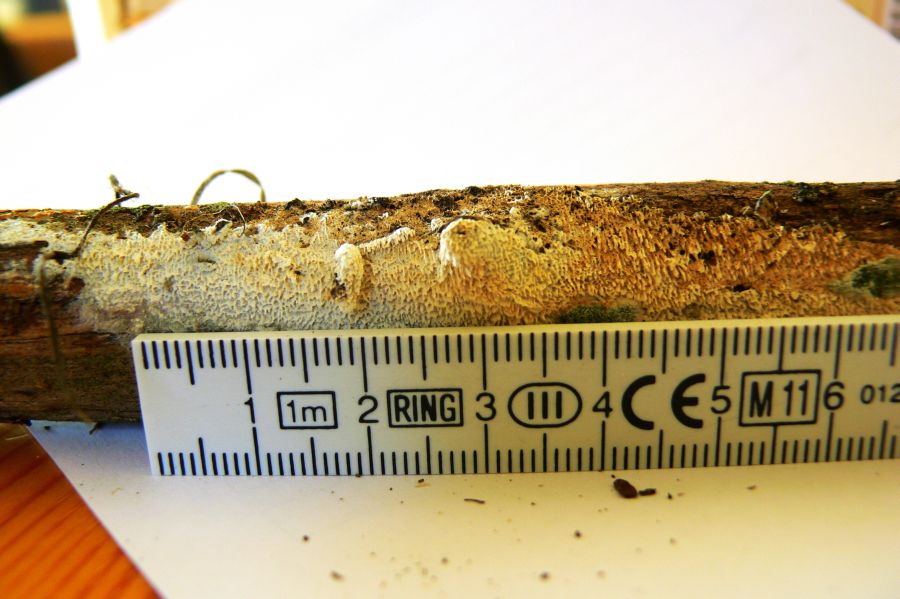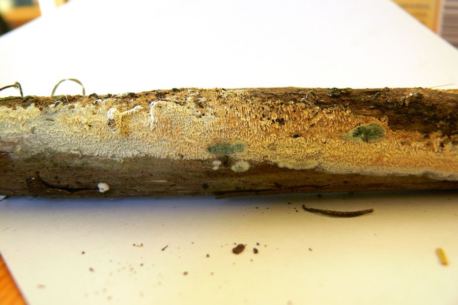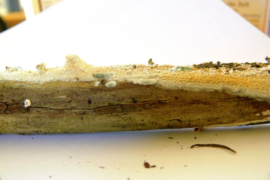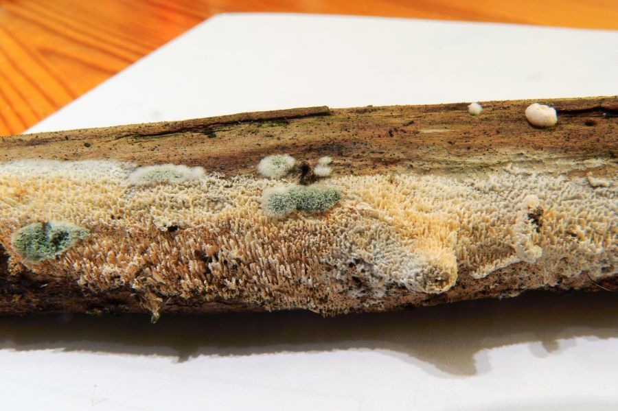 Der größere, nach dem du auch gefragt hast, ist ein Austernseitling (Pleurotus ostreatus), der kleinere, weiße Belag rechts ist der Holunder-Rindenpilz (Hyphodontia sambuci, nicht essbar).