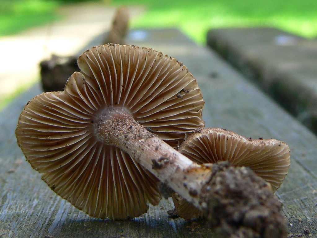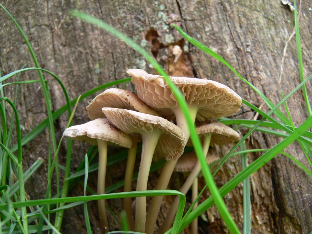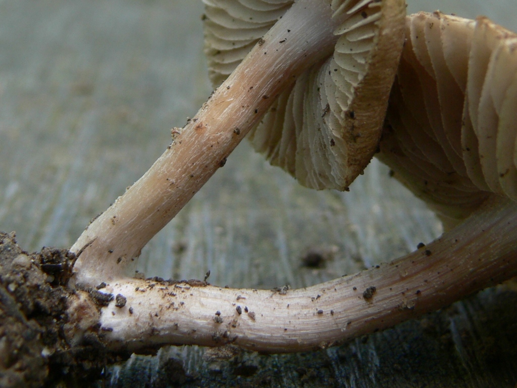 Relativ eingetrocknete Fruchtkörper, aber allem Anschein nach handelt es sich um einen Helmling: Büschelig, zäh, Lamellen mehr oder weniger weißlich, Helmlingshabitus.