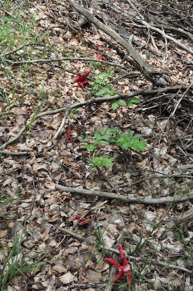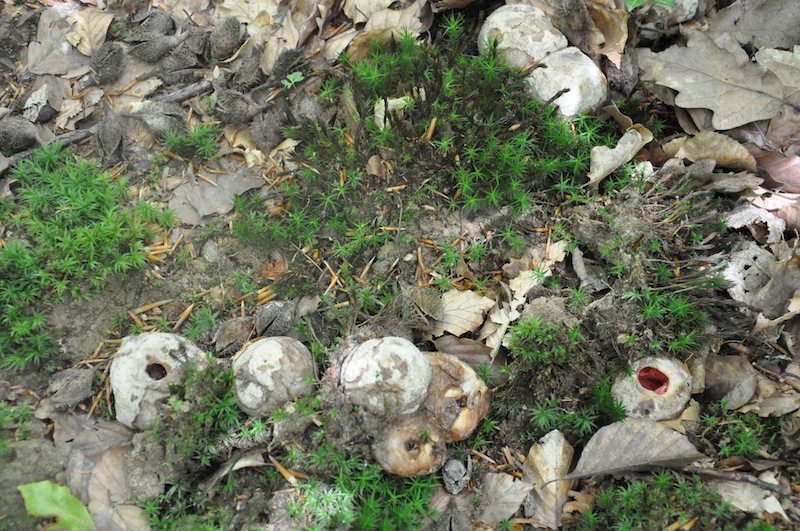 Ich war am Wochenende kurz an unserem Weiher. Na ja, die heftigen Böen und Gewitter beschafften uns wieder mal Arbeit, aber dafür auch Brennholz... Im Weiher, immer am gleichen Sonnenplatz, Ringelnattern, fünf Stück, vier glitten weg, die frisch gehäutete gewährte mir ein Fotoshooting. Im Wald dann verdächtige Eier, es schimmerte rot, wenig später die Auflösung: Tintenfischpilze. Dann, bei meinen Steinpilzstellen, die ersten wieder spriessenden Sommersteinpilze, das Wetter ist ideal für eine neue Welle!! Auf einem Buchenstumpf dann: letztes Jahr bestimmt noch nicht da- eine Kolonie Stockschwämmchen. Zuletzt auf einem Baumstumpf, ein aromatisch duftender Pilz, für mich nach Aenis, doch für den Aeniszähling ist die Farbe nicht sehr passend.? Was war das wohl?