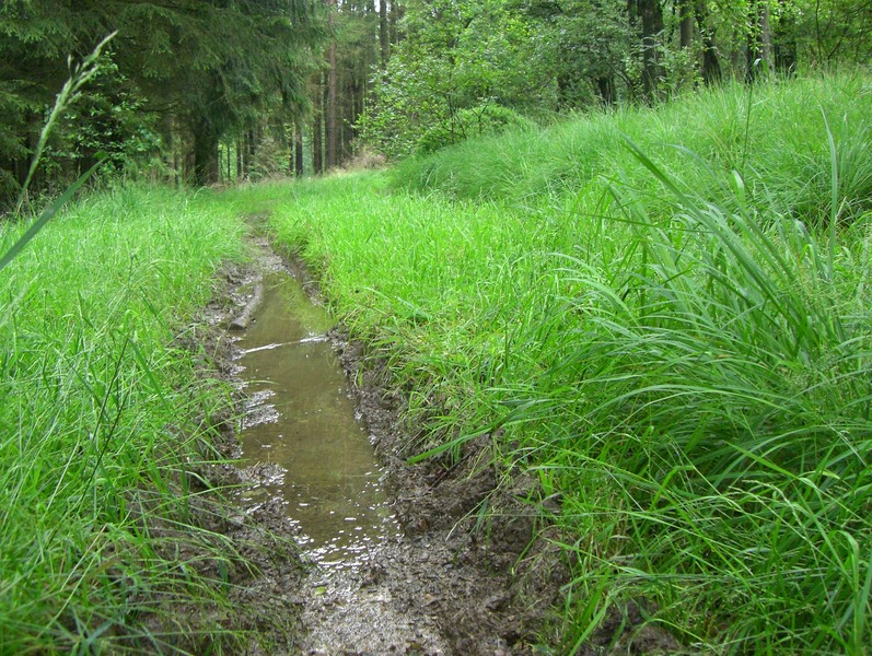 Ich bin zwei Stunden durch neues Gebiet gezogen, habe Fichtenschonungen, Fichtenhochwald, Buchen/Eichenmischwald und einen kleinen Birkenhain durchstiefelt. Bin über Regenwasser gespeiste Bäche gesprungen und durch aufgeweichte Erde gewatet. Die Gummistiefel sind brav an den Füßen geblieben, auch wenn ´s schonmal bedrohlich schmatzte