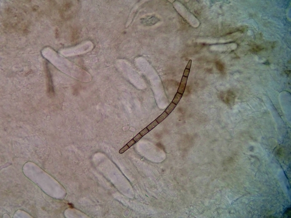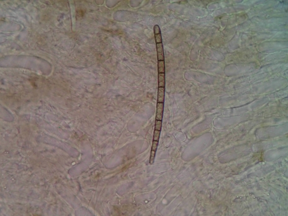 Reife Sporen zwischen 108 µm x 5 µm und 112 µm x 7 µm, 7 bis 12 mal septiert.
