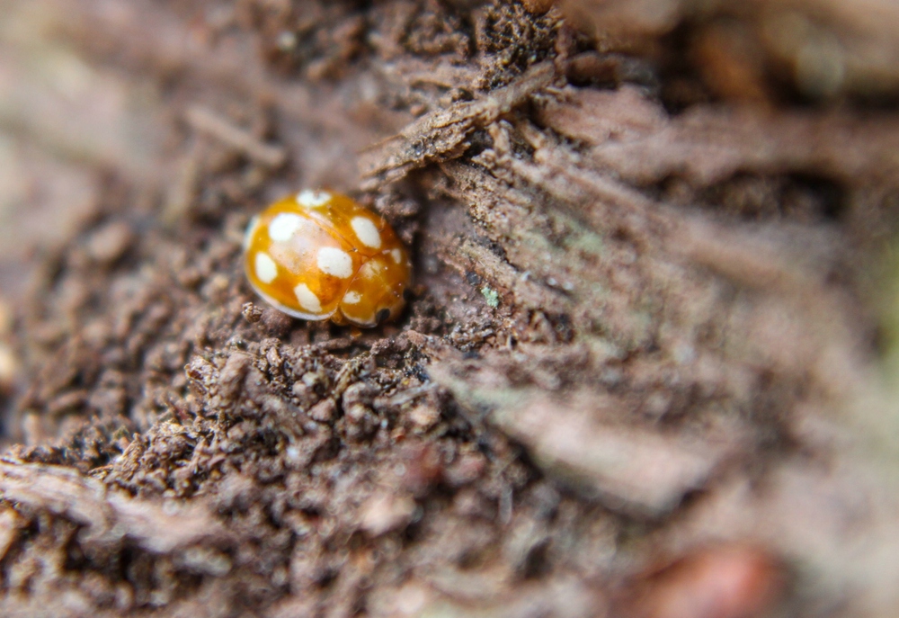 6. Ich wollte nur ein bisschen unter der losen Rinde nach Becherchen gucken, da lag er, der Marienkäfer, noch im Winterschlaf. Natürlich wurde er wieder zugedeckt