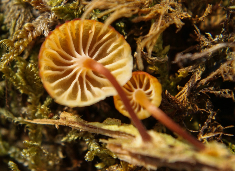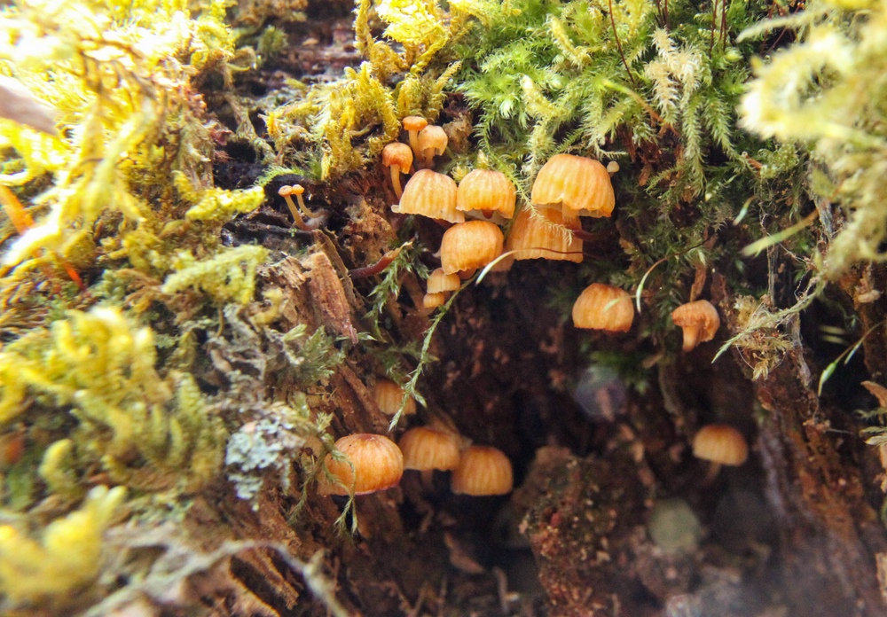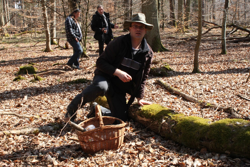 Wir verteilten uns im Unterholz, gingen ein Weilchen unseren Nasen nach. Dann sah ich etwas gelbes an einem Baumstumpf aus dem Moos leuchten! Das muss doch mal aus der Nähe betrachtet werden....