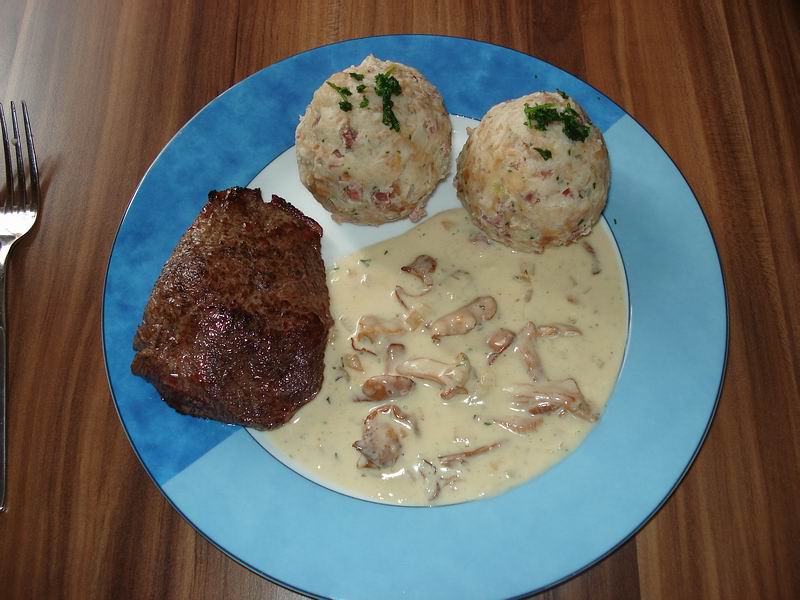 Tiroler Speckknödel mit Rinderfilet und Pfifferlingrahmsauce.