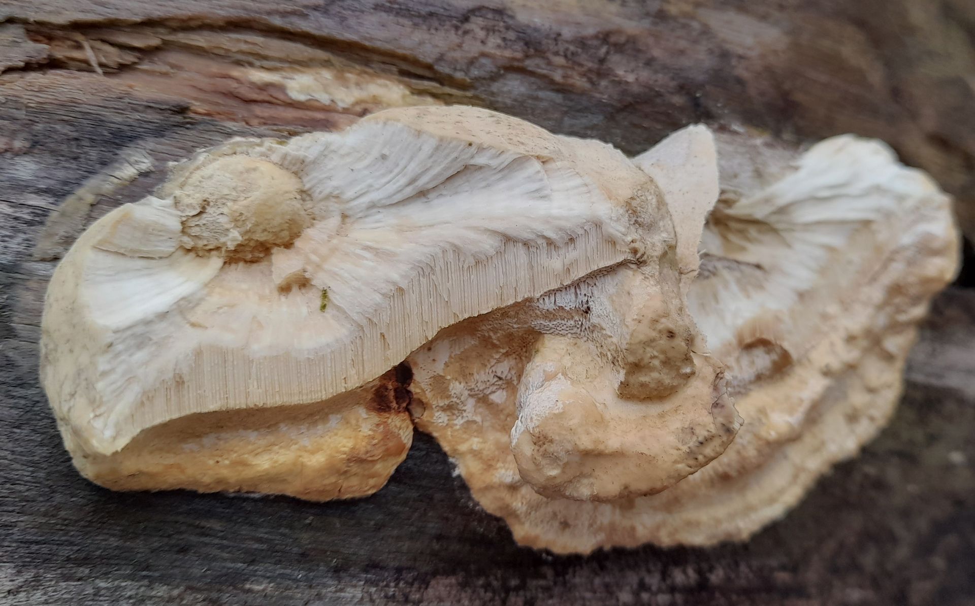 Als noch Frost war, sind wir etwas gewandert. Meine Frau hat an Holz einen Porling entdeckt. Fotos hat sie auch gemacht und ein Stück vom Pilz mitgenommen.