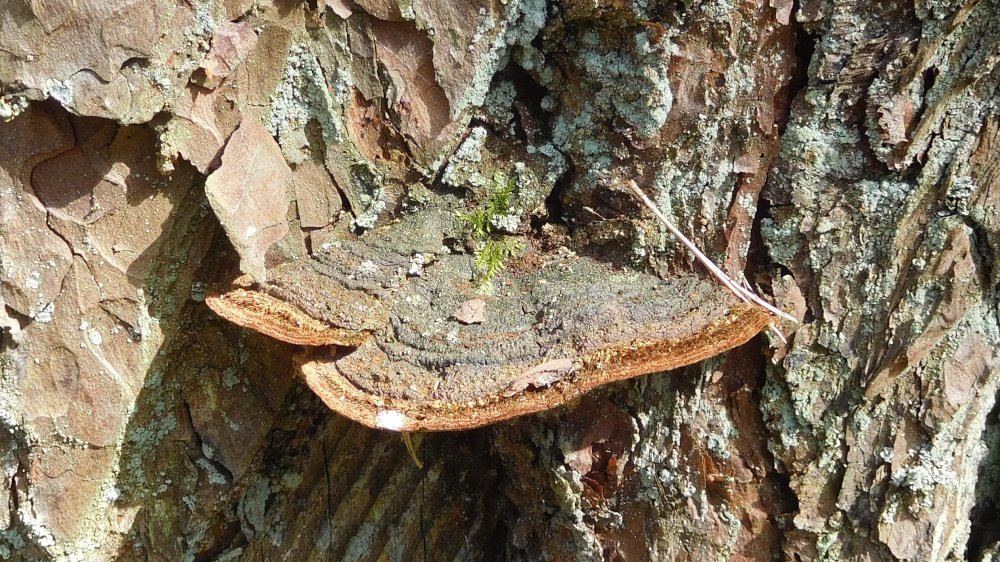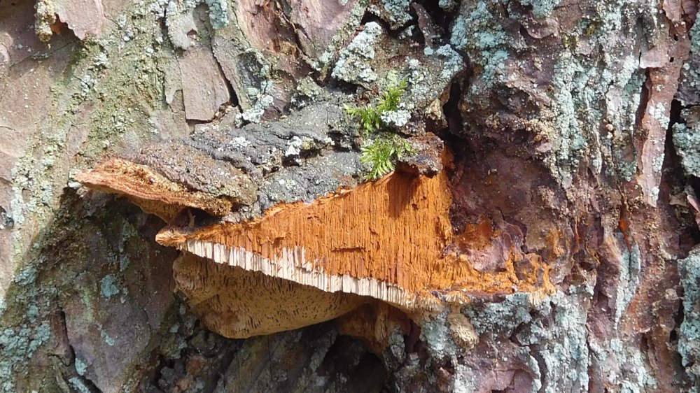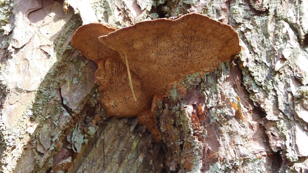 Beim Tintling habe ich die beste Beschreibung gefunden: Poren groß, unregelmäßig. Das sollte passen. Der Pilz wächst auch genau oberhalb einer "Schadstelle" (durch Harzgewinnung). Das sollte auch passen genau wie die scharfe Kante und die Farbe. Dann wäre das heute ja noch ein persönlicher Erstfund.