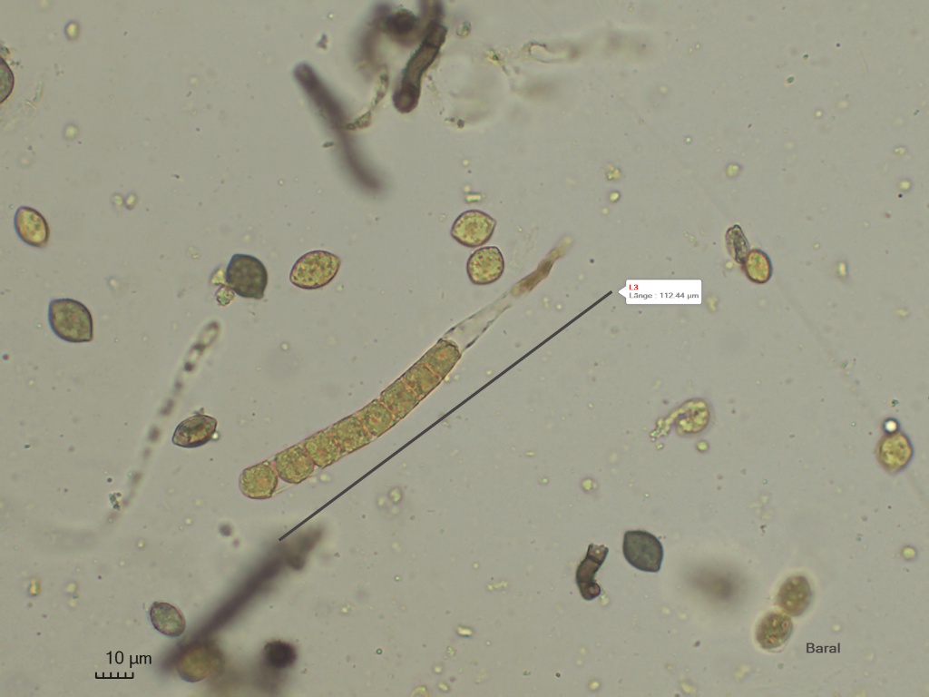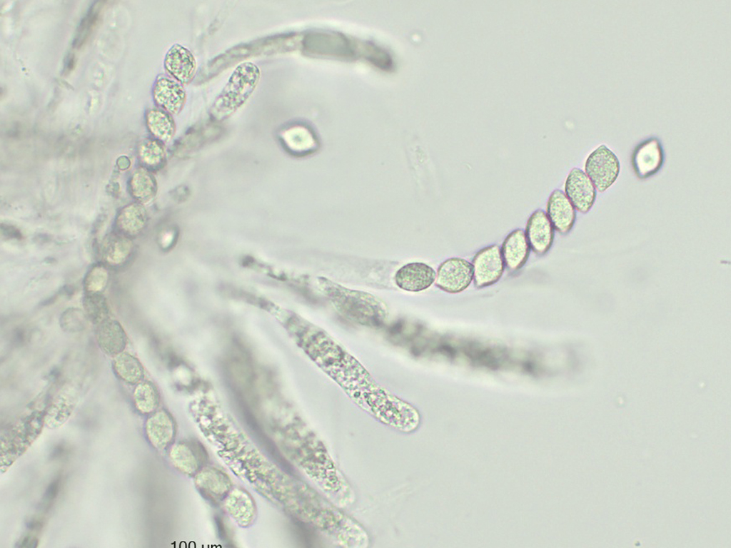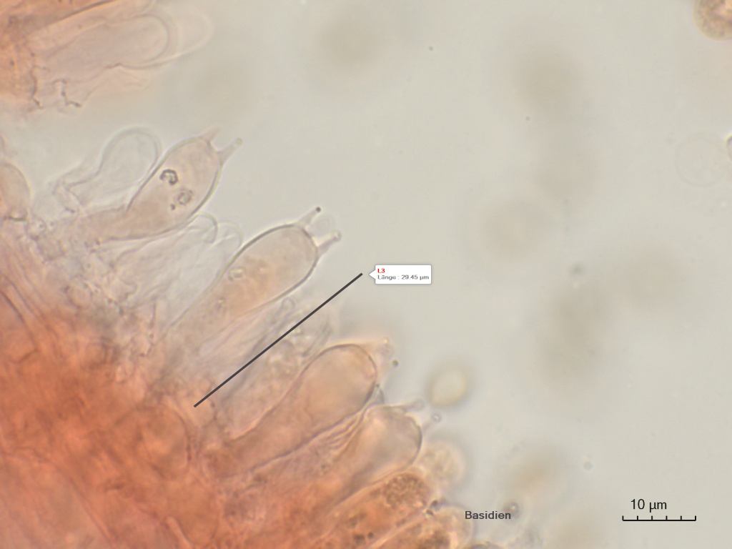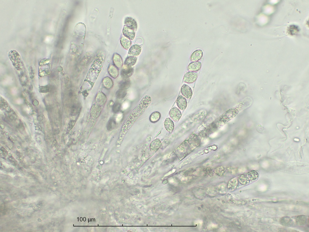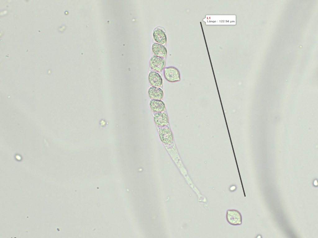 Auch wenn die Grösse der Sporen tatsächlich etwas klein ausfällt, finde ich, dass das umgekehrt keulenförmige und lange Pedicel und die obere, exentrische, üppige kanalisierte Caudae einfach sehr typisch für die Art sind.