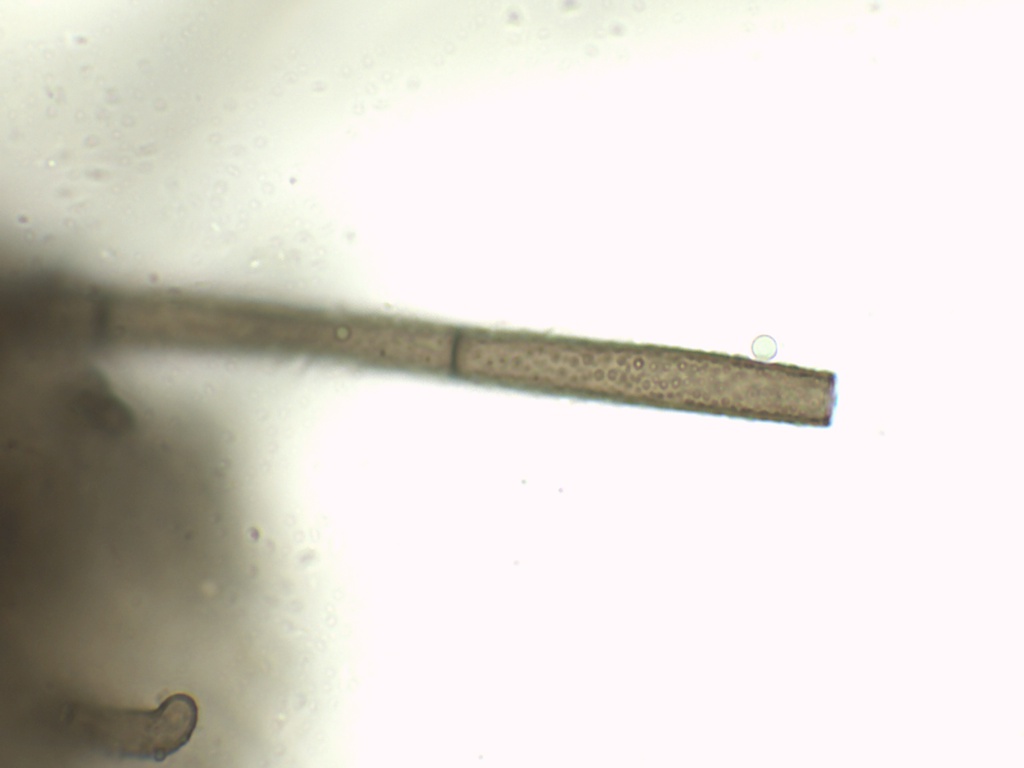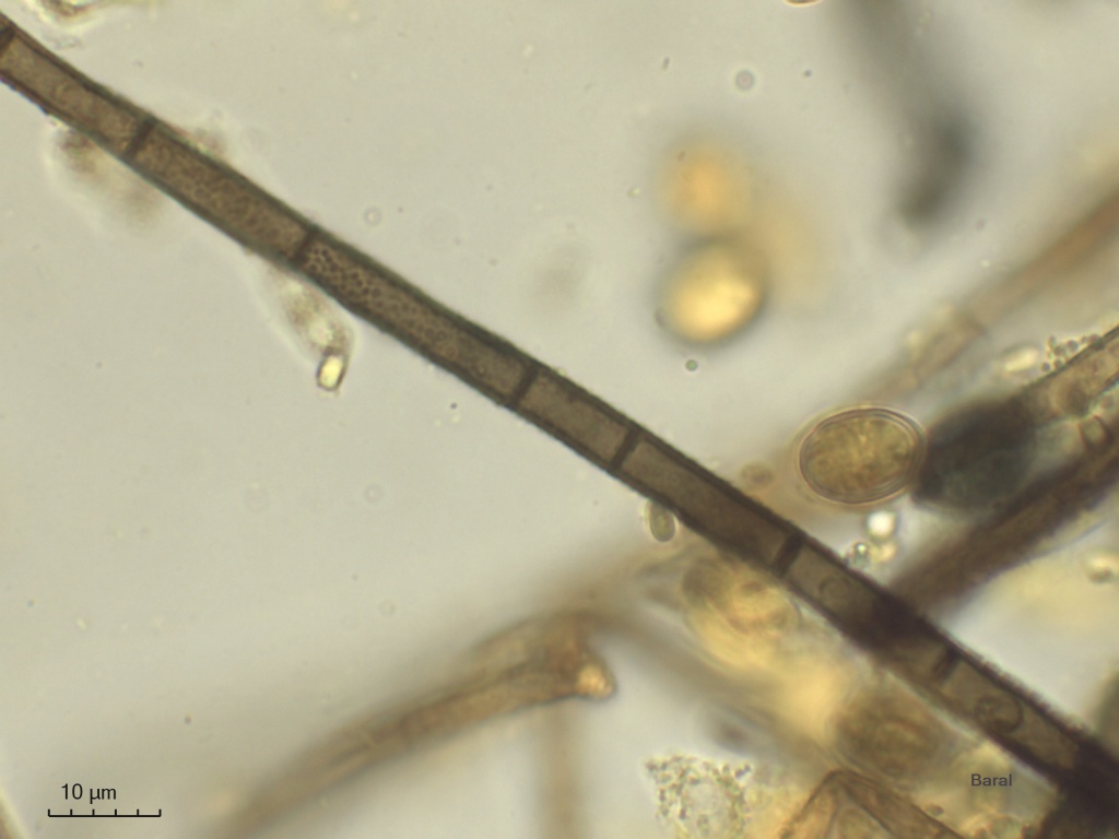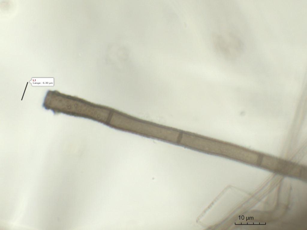 basal und auch dazwischen viele gerade, deutlich septierte und inkrustrierte Haare