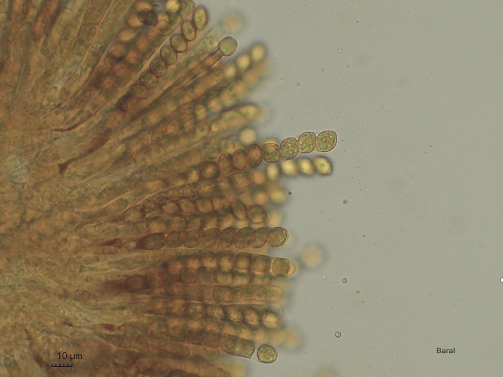 Das die Sporen, insbesondere in der Länge, sehr variabel sein können, und die Asci auch biseriat sein dürfen, ist ja schon öfters kommunizert worden. Ob diese Septierung noch in die Variationsbreite der Art fällt, kann ich leider nicht sagen. In Summe aller Bestimmungsmerkmale wäre ich aber auch bei Delischia winteri gelandet.