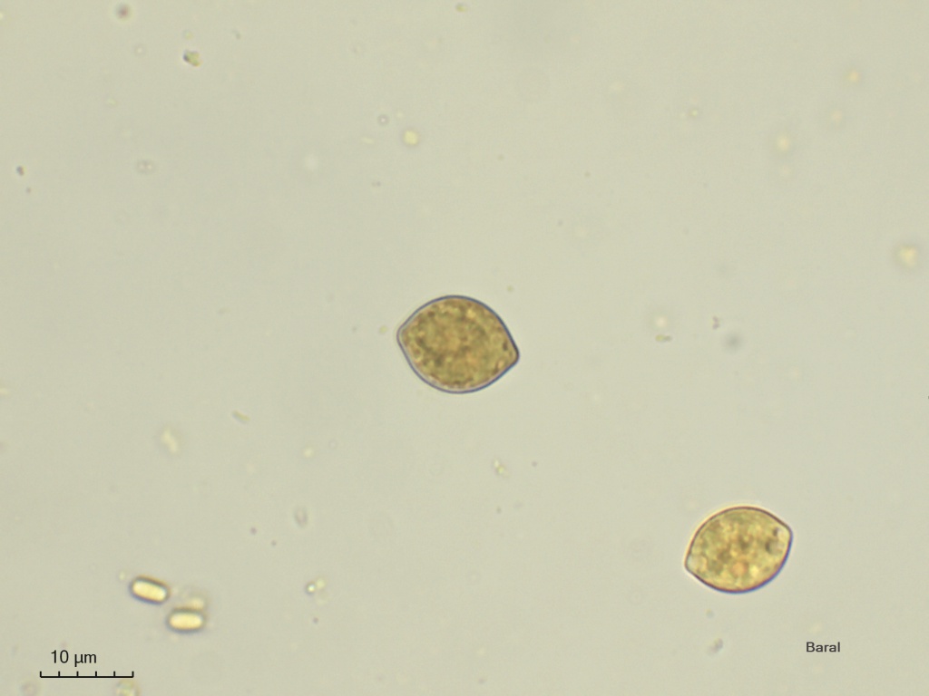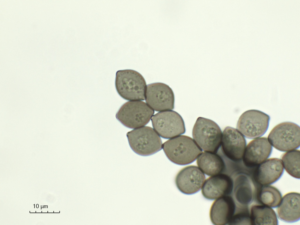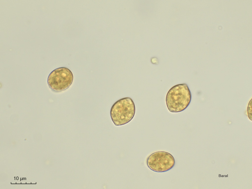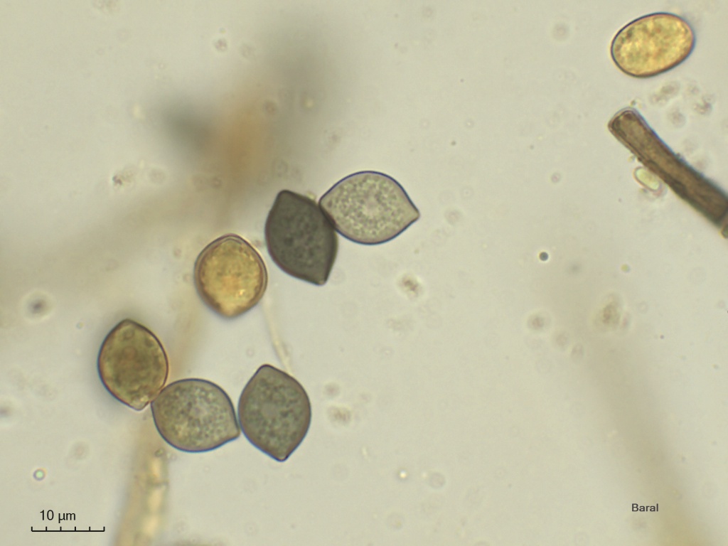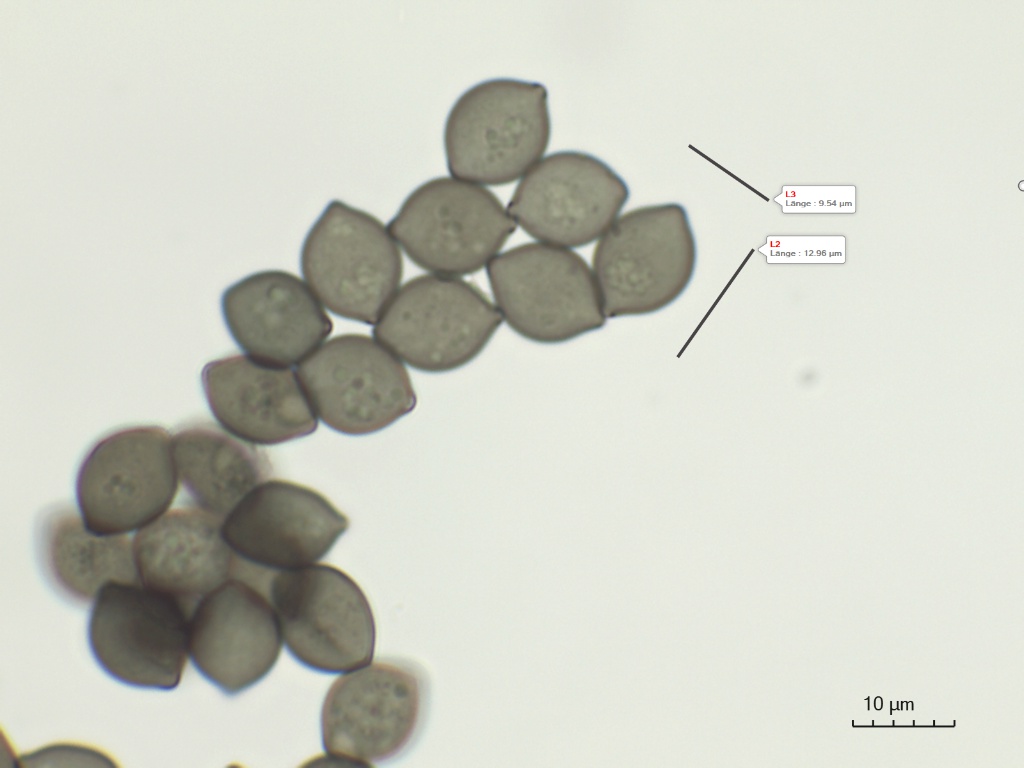 Die Sporen haben oft unterschiedliche Reifegrade, reife Sporen in H2O: 11,0-12,5-13,1 x 8,5-9,3-9,5µ, mit zwei Keimporen