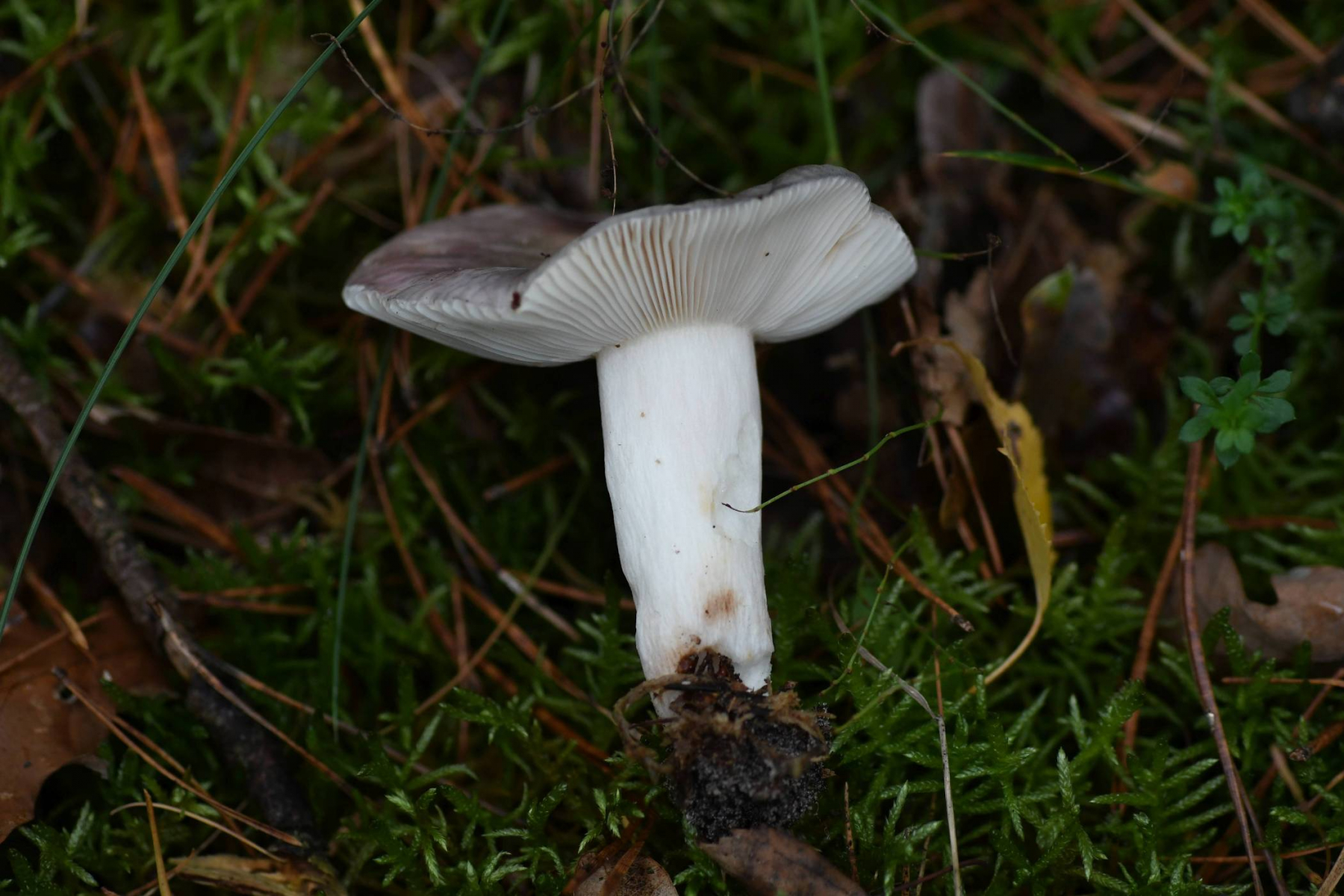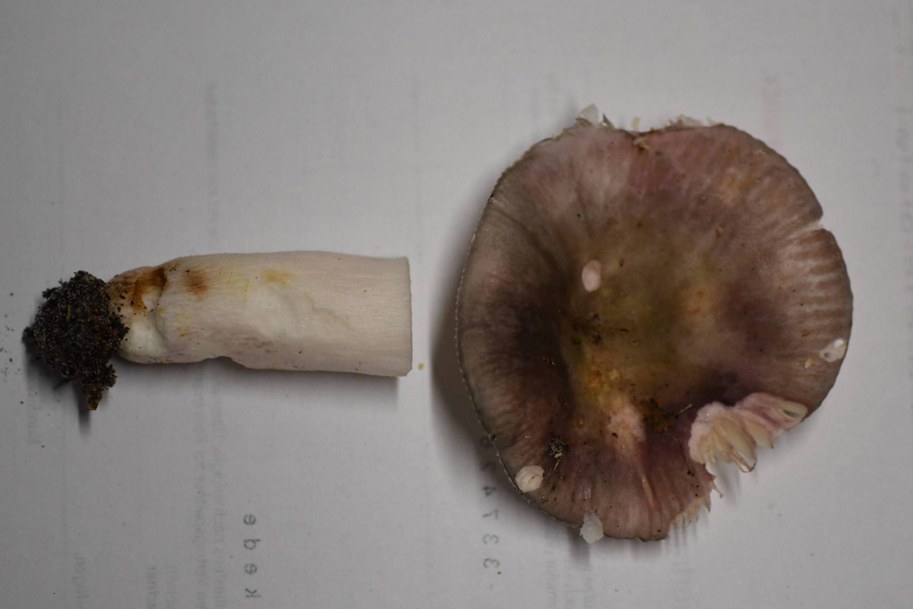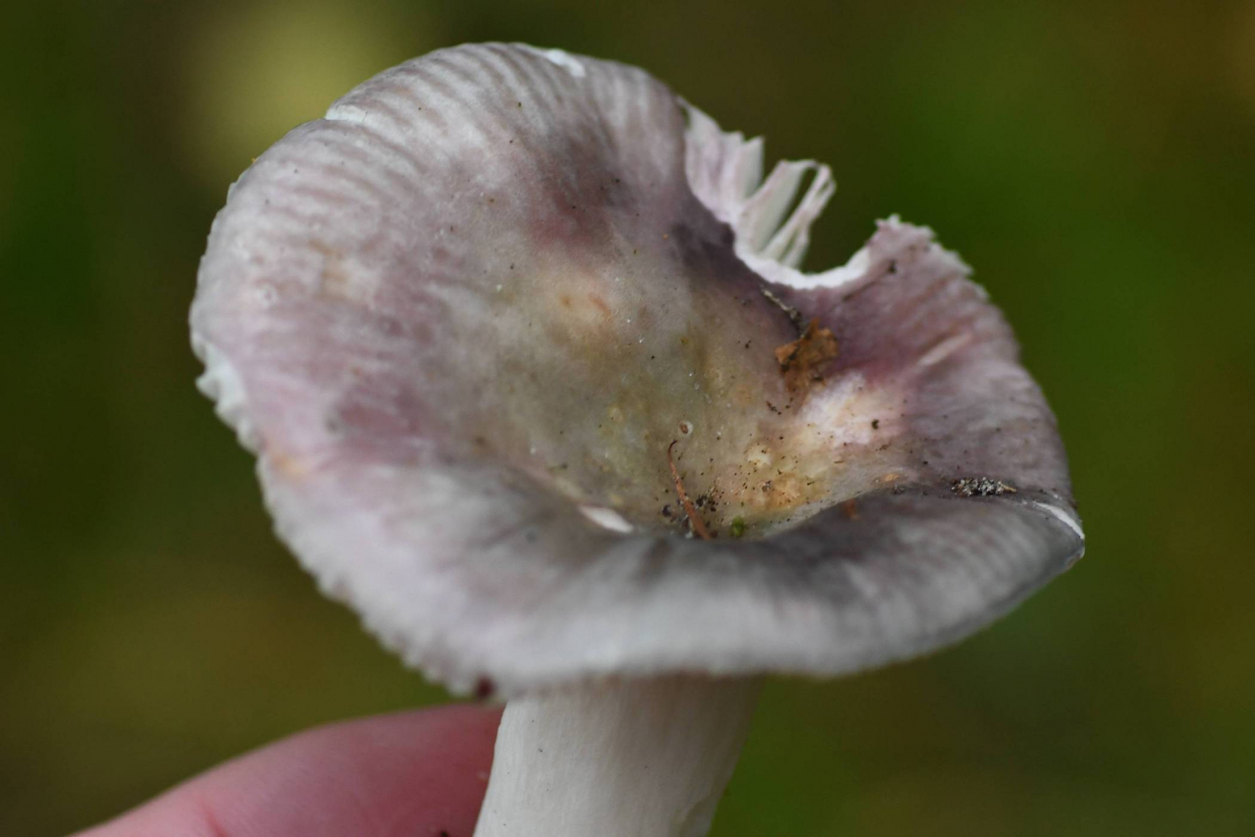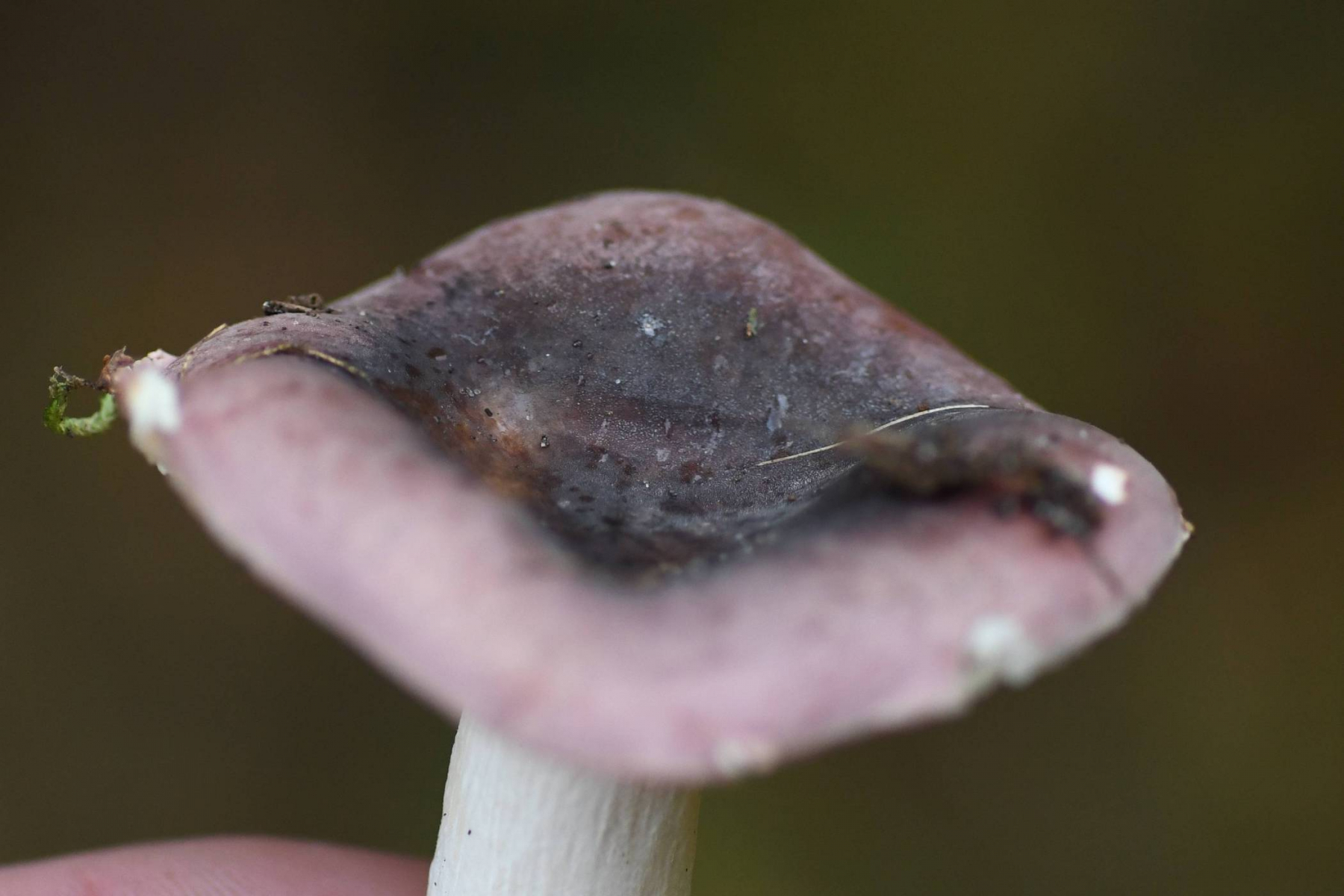 Hut: hell grauviolett, in der Mitte grünlich, Huthaut etwas über die Hälfte abziehbar