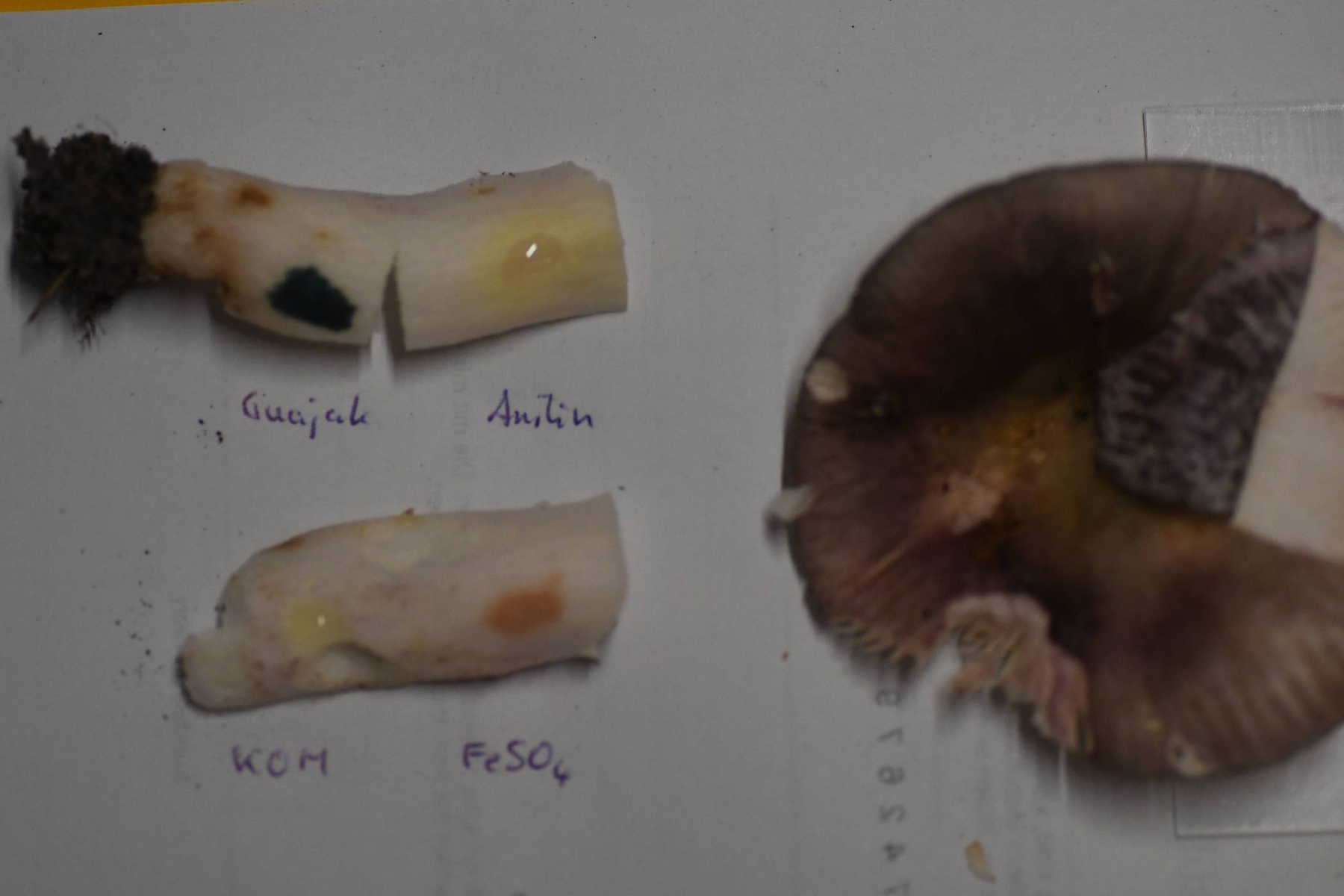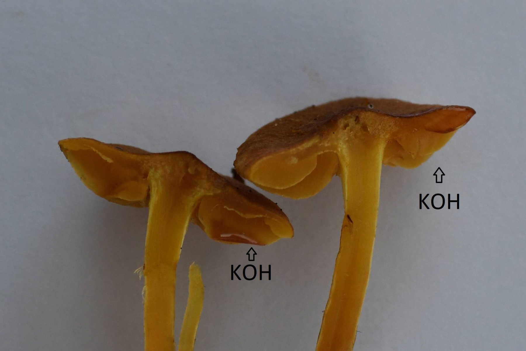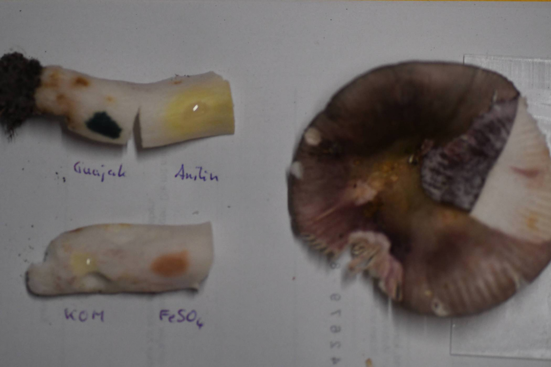 Ich habe etwas KOH auf die Lamellen gegeben (jeweils auf der rechten Seite). Die Lamellen verfärben sich rotbräunlich.