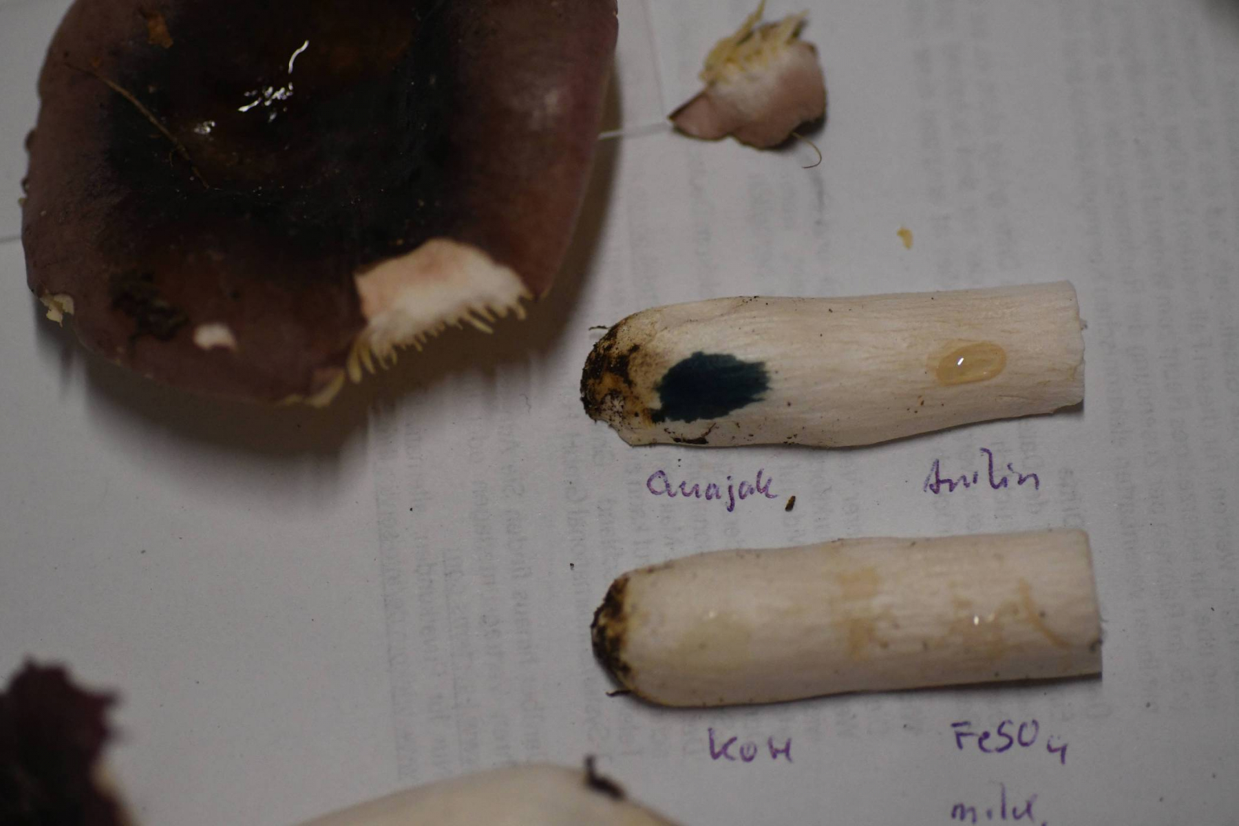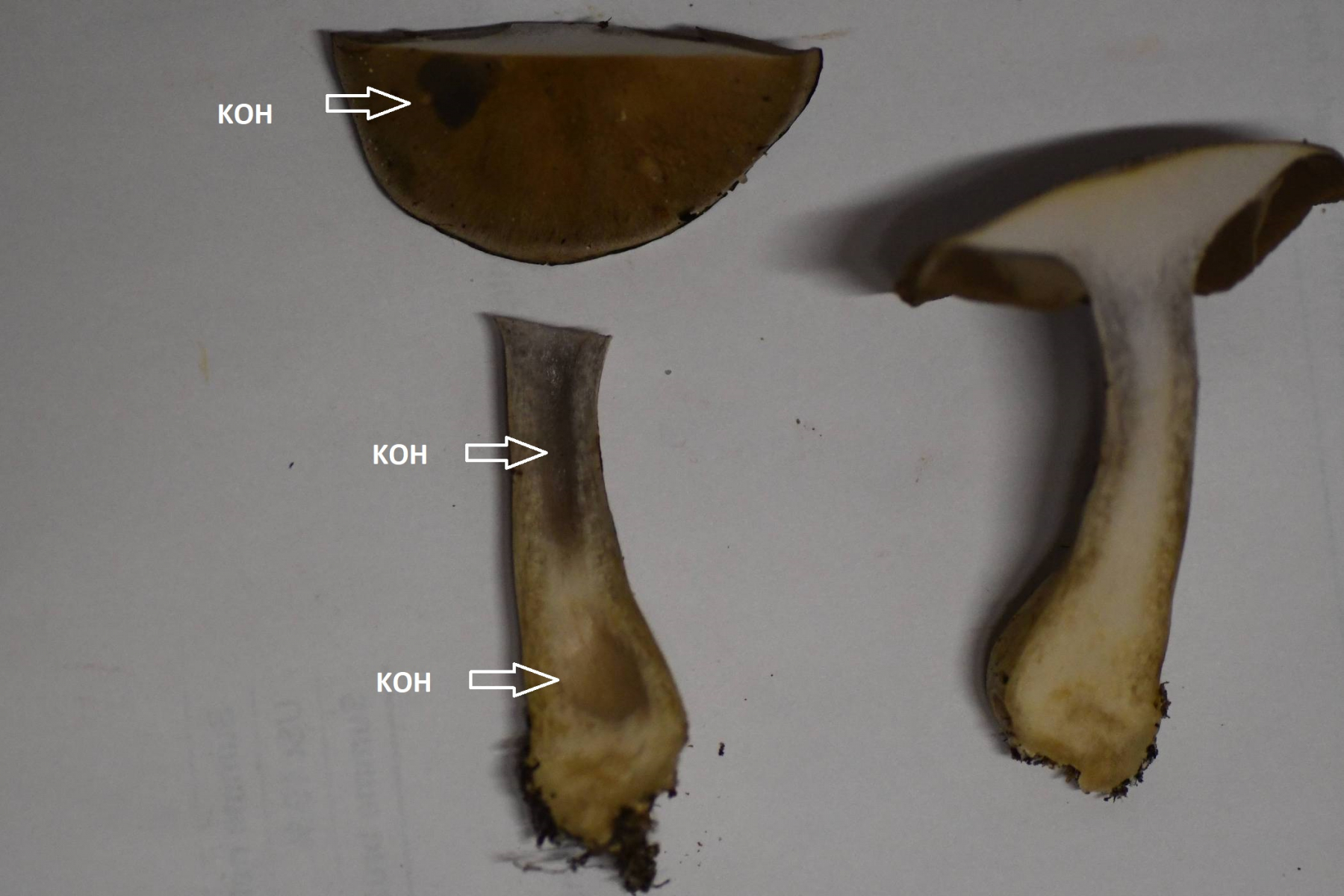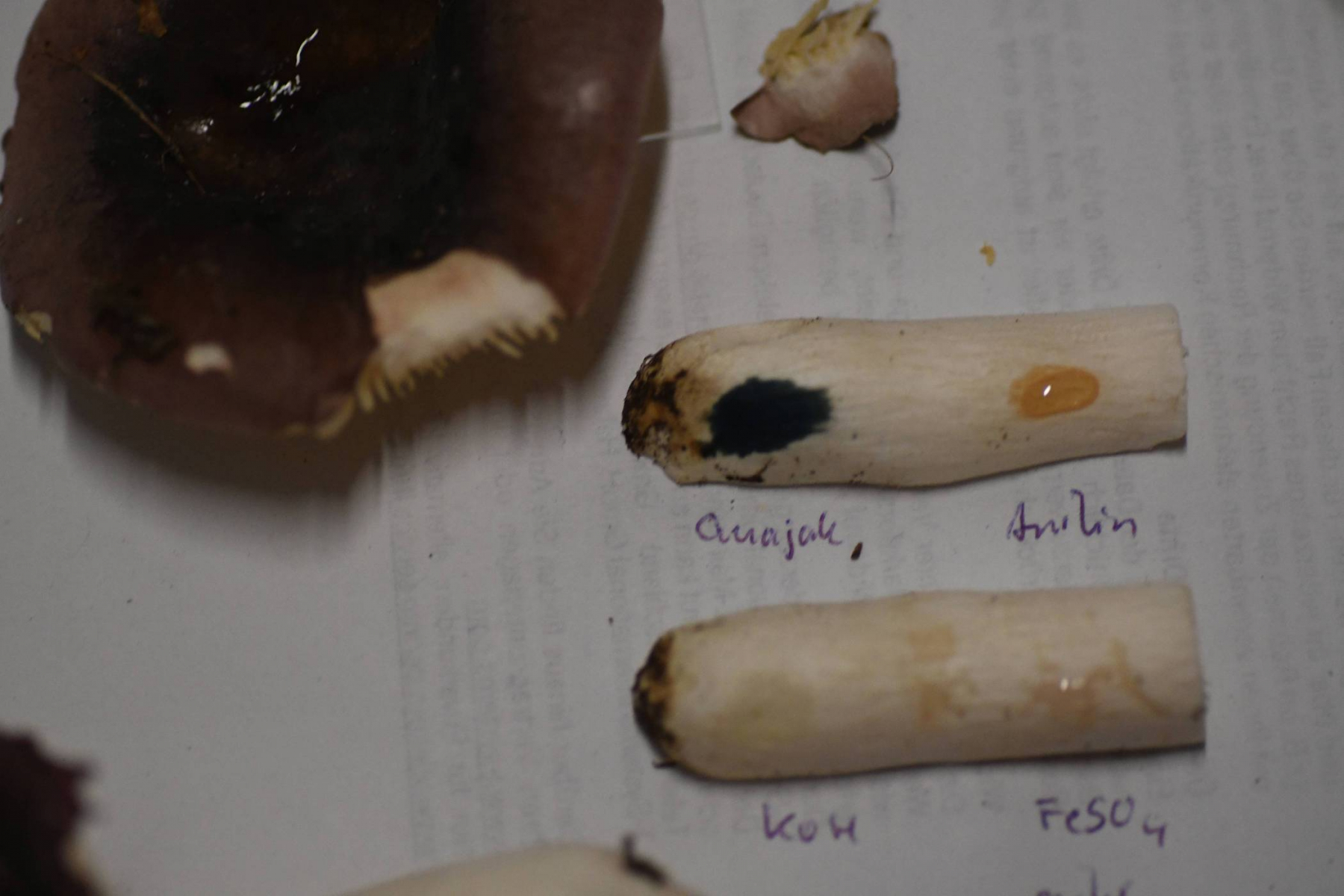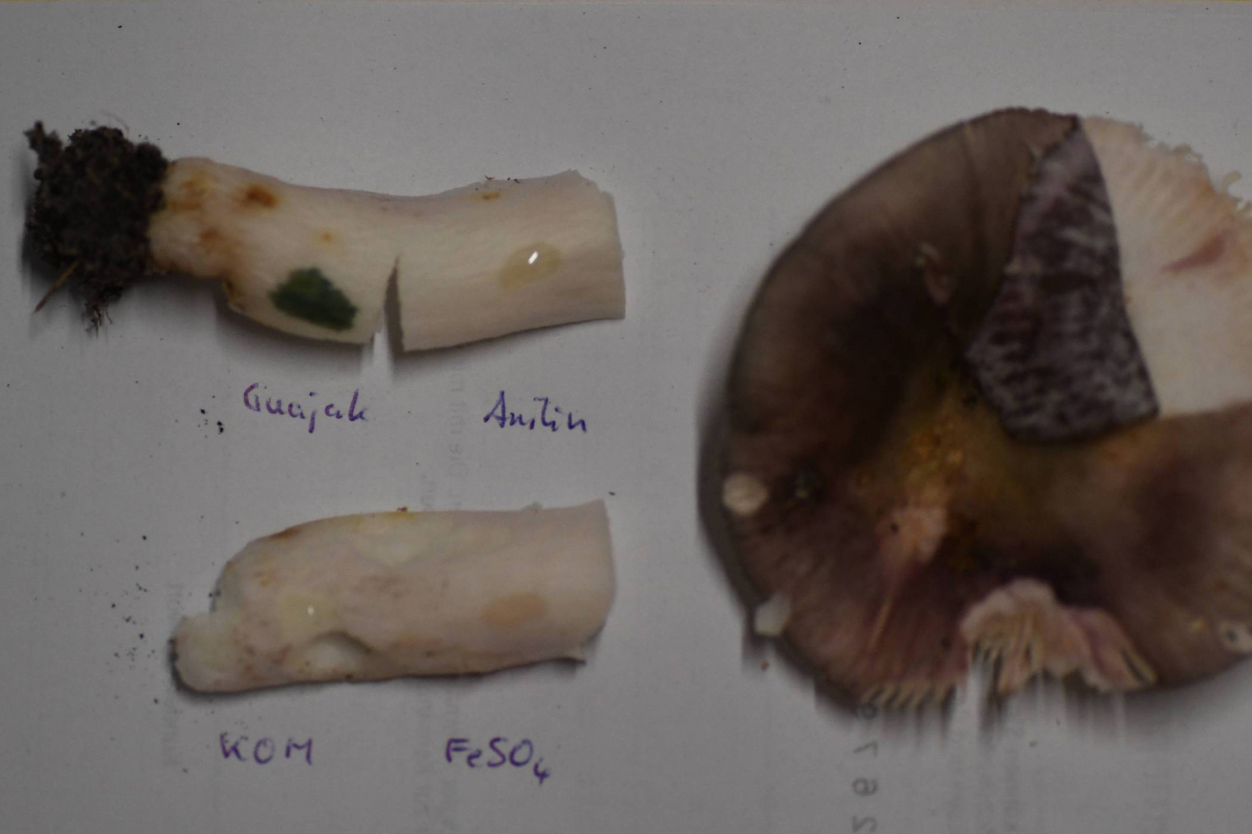 Ich habe etwas KOH auf die Lamellen gegeben (jeweils auf der rechten Seite). Die Lamellen verfärben sich rotbräunlich.