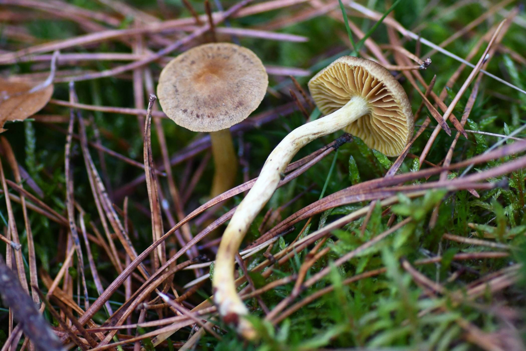 Ich habe noch mal ein paar frische Exemplare der gelbblättrigen Hautköpfe gesammelt. Am Standort ist in der Tat reichlich Sphagnum vorhanden; die Pilze wachsen (ebenso wie die dazwischen stehenden C. semisanguineus) überwiegend in den Torfmoospolstern.