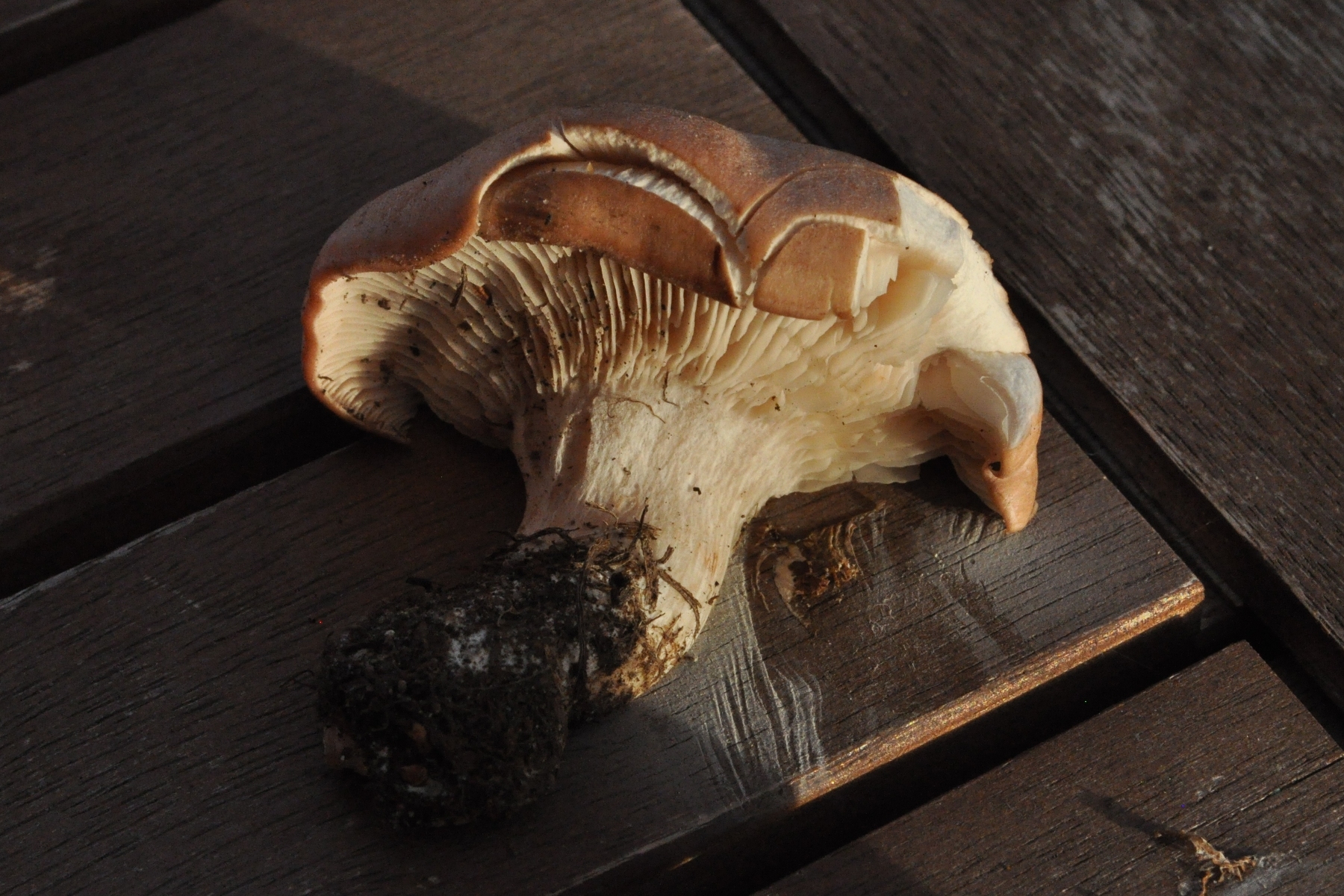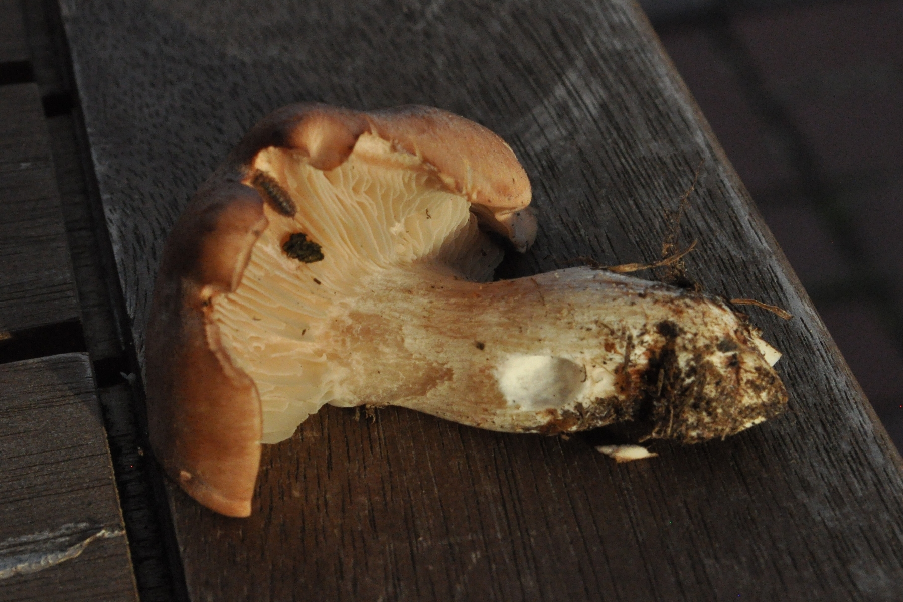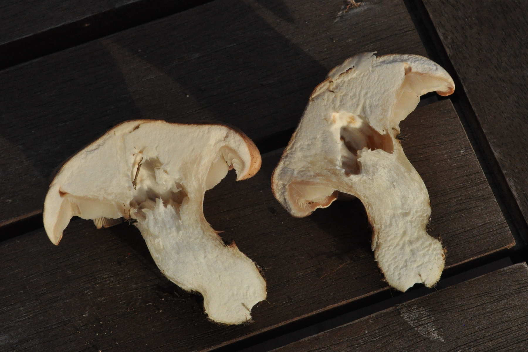 Vom Habitus dachte ich zuerst an einen Milchling, aber die Pilze milchen nicht, die Lamellen sind zwar starr, aber nicht spröde, und der Stiel ist deutlich längsfaserig. Das Fleisch ist sehr fest, geradezu hart, der Hut bricht an den Seiten leicht quer ab (s. Fotos). Geschmack mild, etwas bitter; den Geruch würde ich pilzartig-würzig nennen.