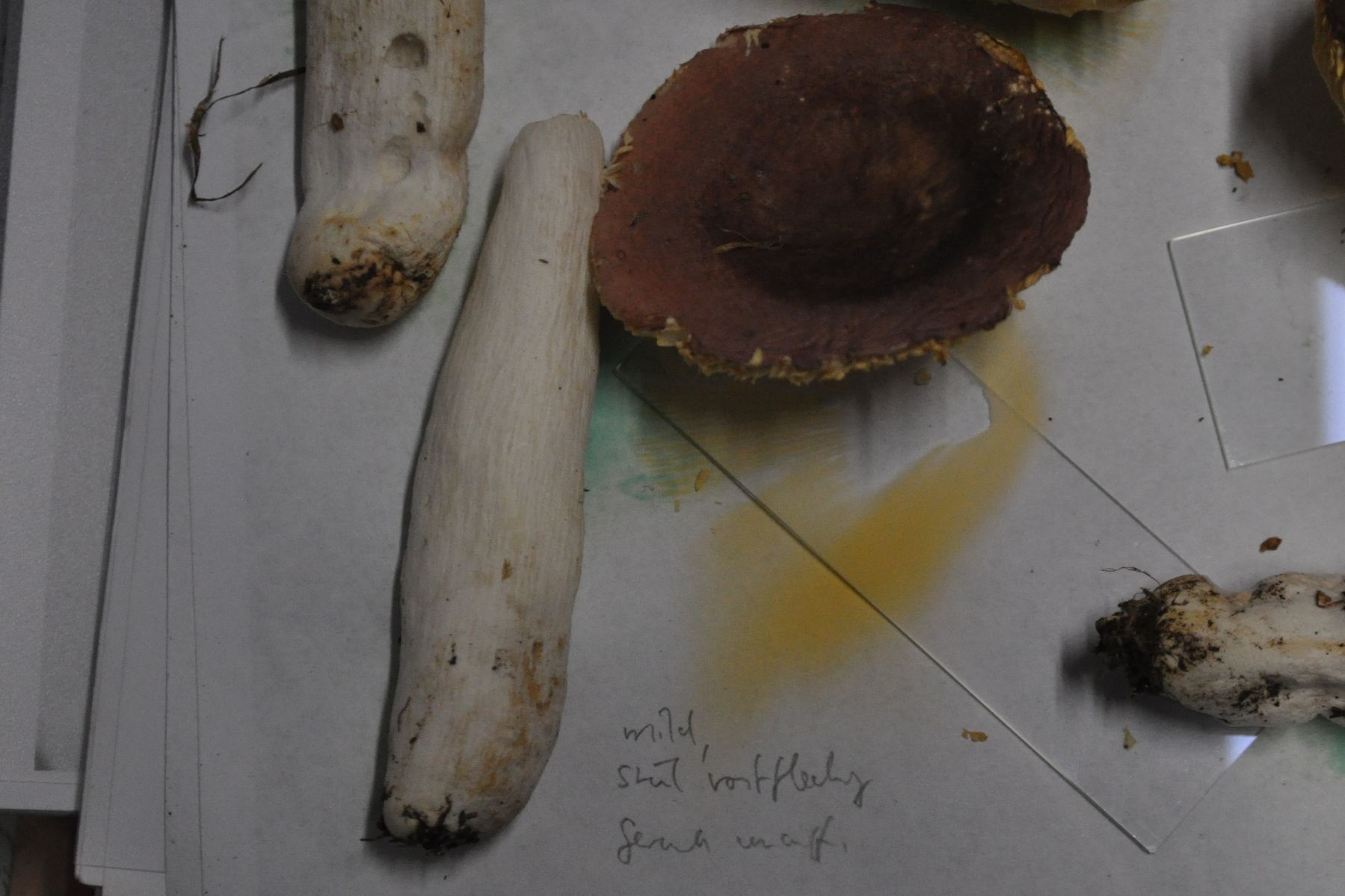 Geruch etwas fruchtig; Geschmack mild; Stiel ziemlich fest und starr, von unten her bräunend; unter Eichen; Lamellen bei den beiden schon älteren Exemplaren leicht sahnegelblich; Spp IIc-IIIa