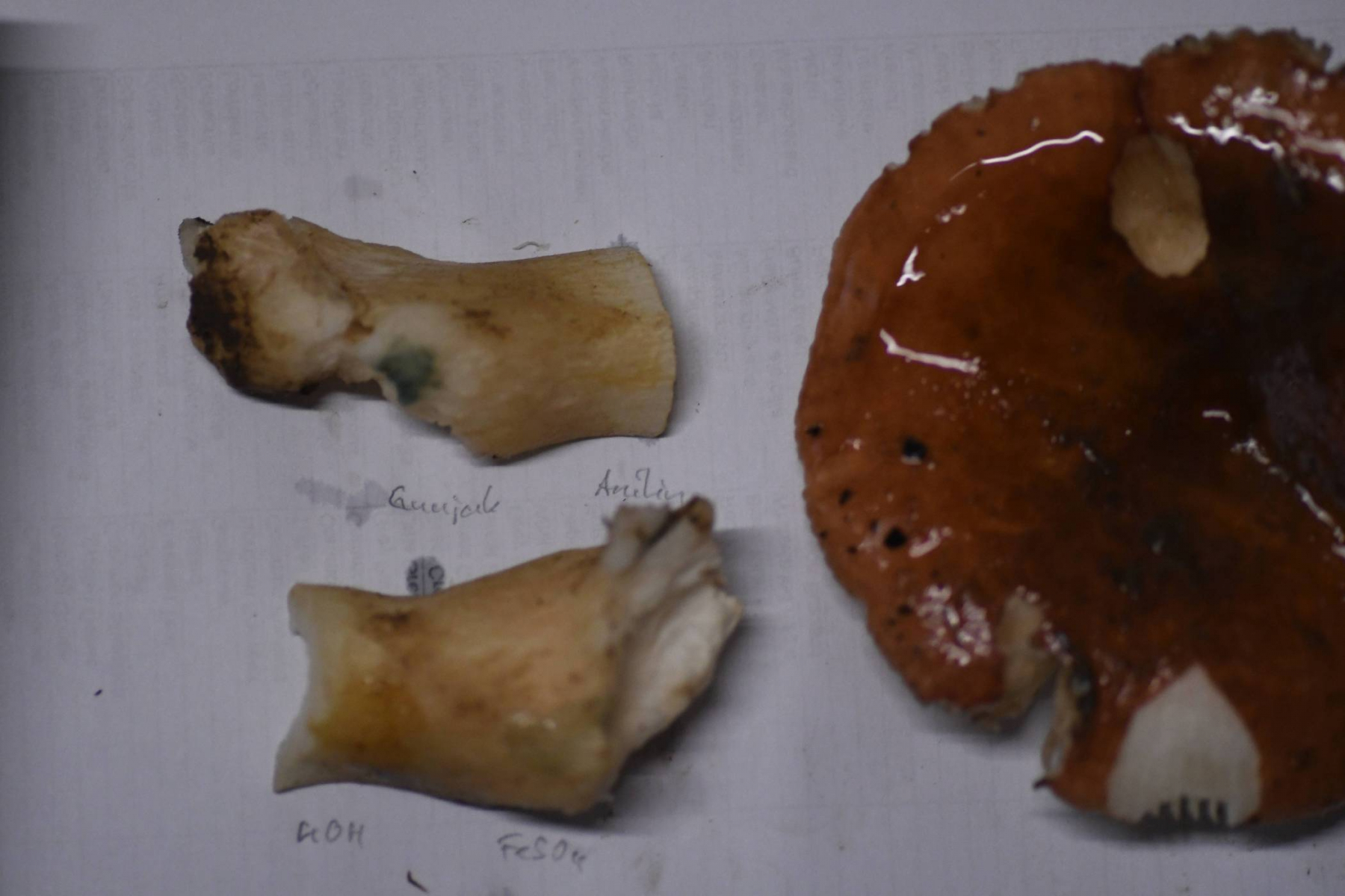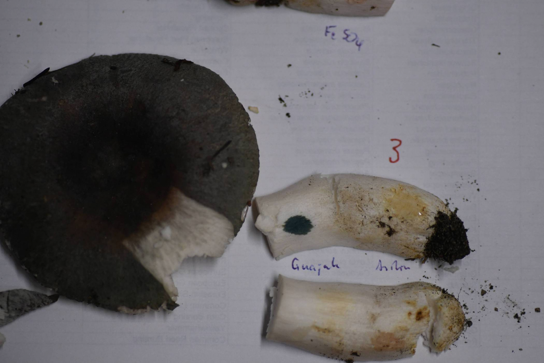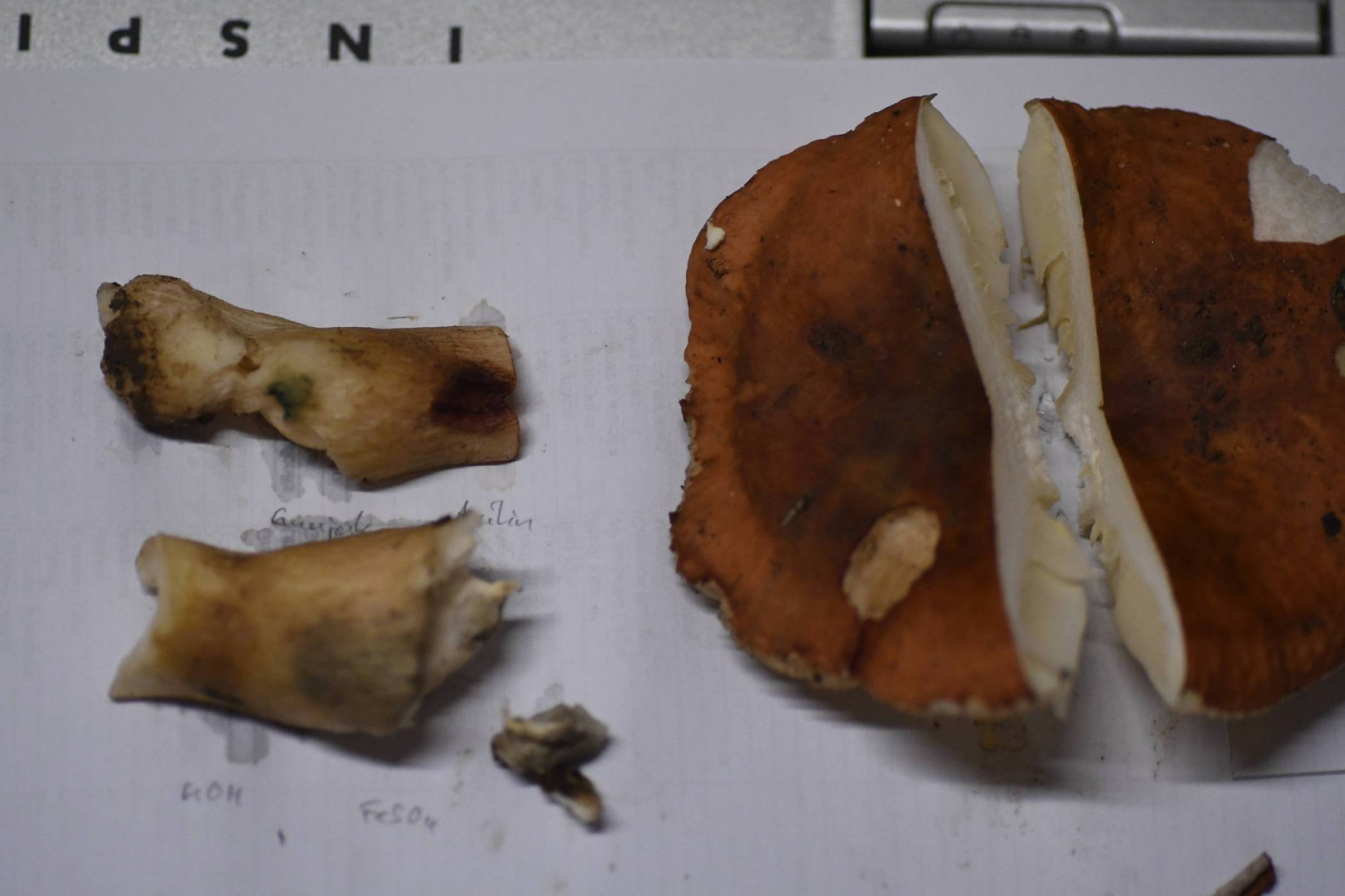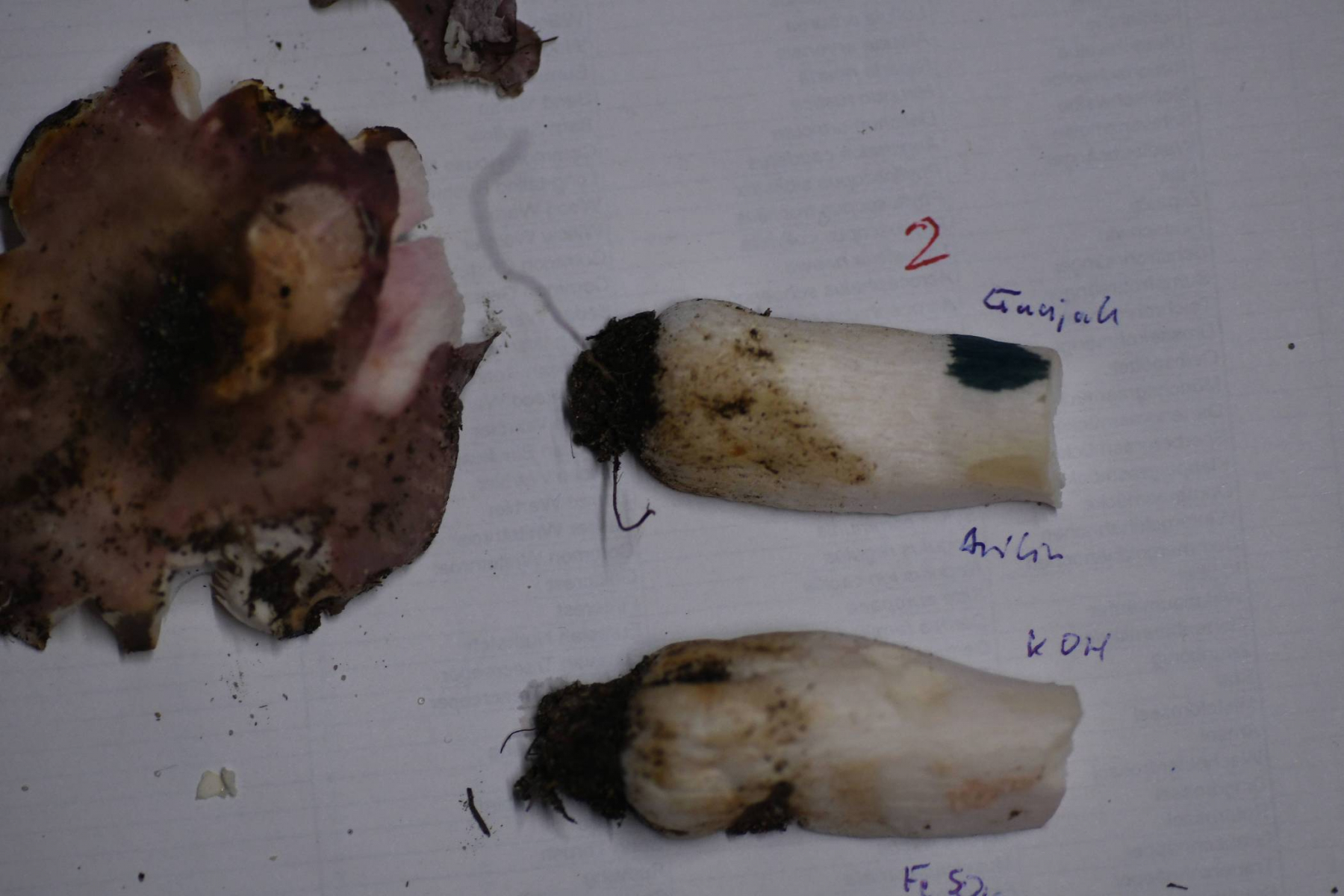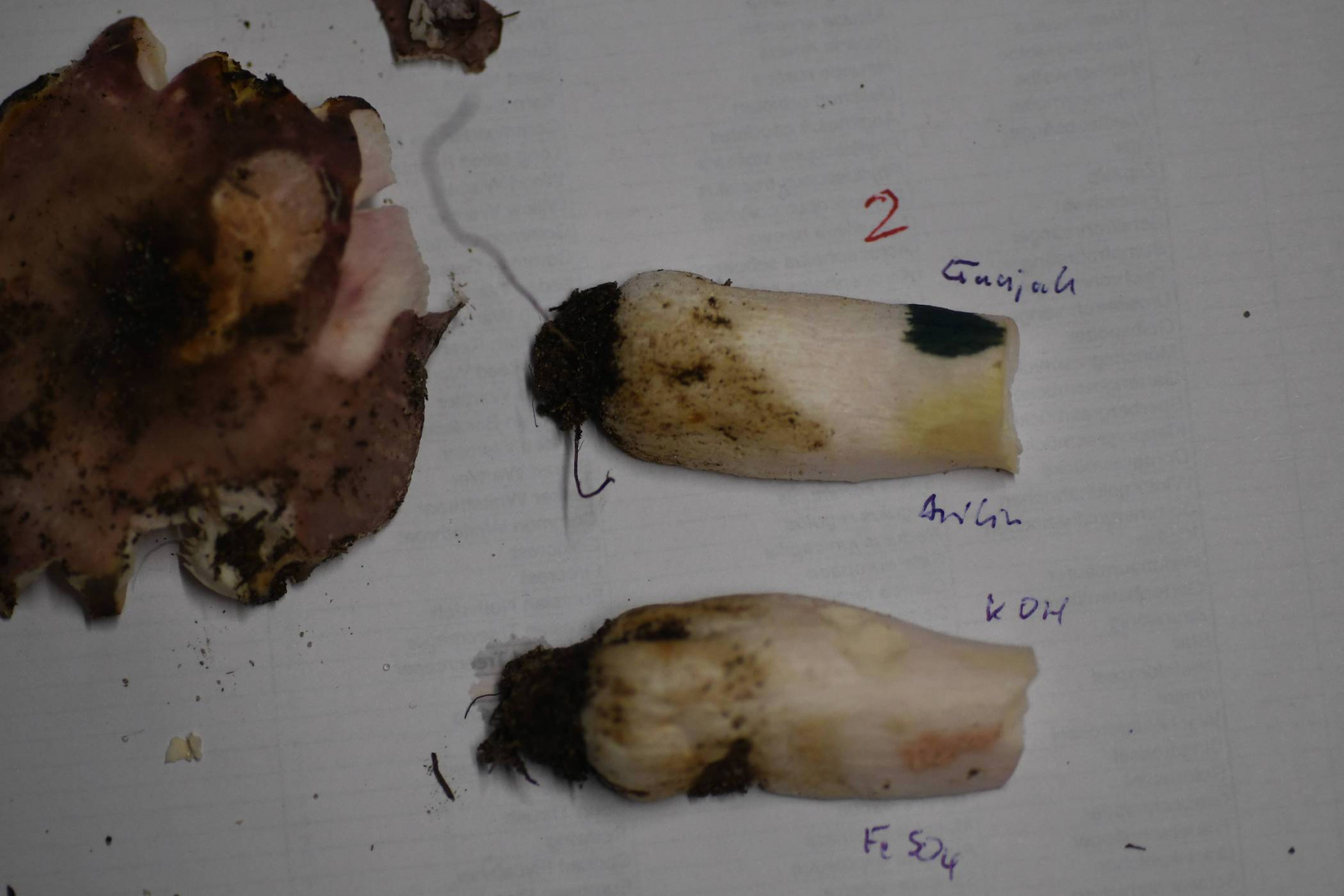 R. terenopus wird bei Bresinsky von den anderen durch den "süßlich-kompottartigen, an R. fellea erinnernden" Geruch abgetrennt. Davon abgesehen, passen die genannten makroskopischen und die Standortmerkmale ganz gut zu meinem Fund, allerdings heißt es hier "Fleisch an Insektenfraßgängen etwas gilbend", was nicht so ganz passt, meine Pilze gilbten ja sehr deutlich in allen Teilen.