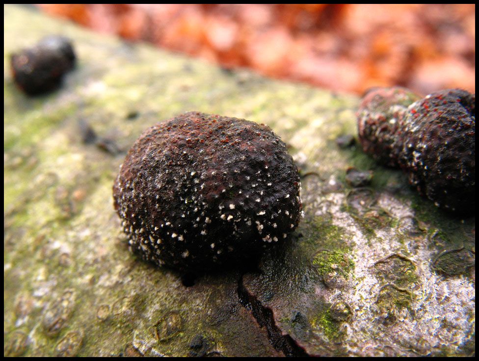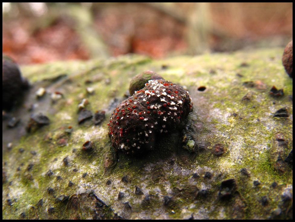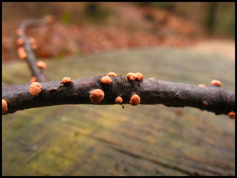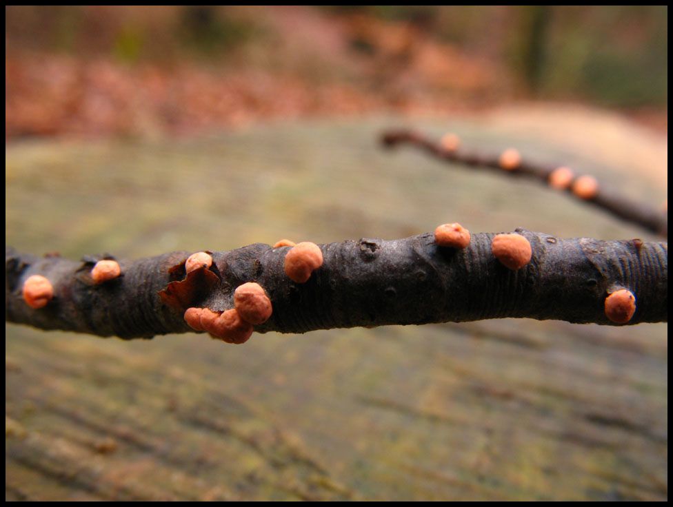 Ein weiterer Erstfund ist auch das irgendwie. Ich muss allerdings zugeben, dass ich weder weiß, was diese - mir durchaus bekannten - knubbeligen Dinger am Buchenast sind, noch was auf ihnen für kleine Pünktchen wachsen, die mit bloßem Auge übrigens kaum wahrzunehmen waren.
