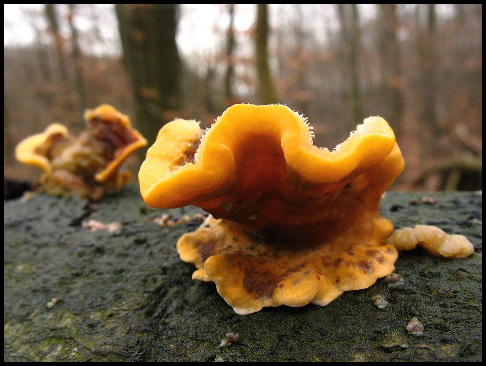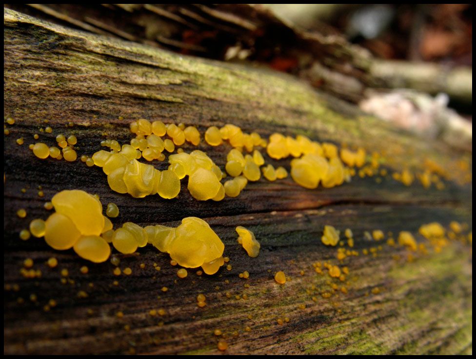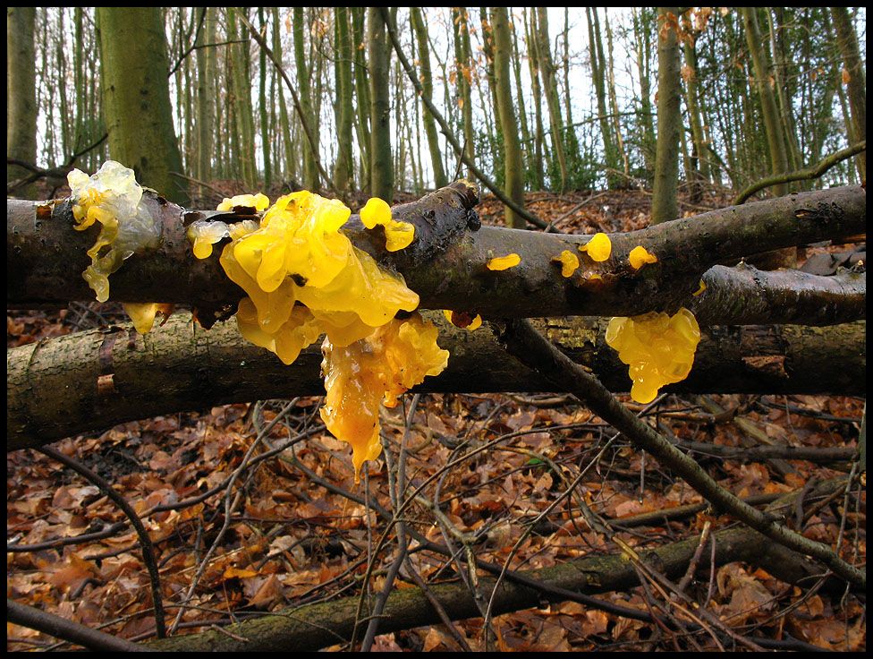 Wo wir dann schon bei unidentifiziertem, farblich auffälligem Kleinkram sind, schieb ich mal noch zwei Fraktionen aus dem gelben Teil der Farbpalette nach, die ich bei den Gallerttränen einordnen würde. Der Goldgelbe Zitterling (Tremella mesenterica) dient hier lediglich der farblichen Ergänzung.
