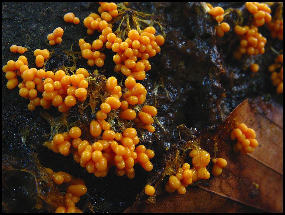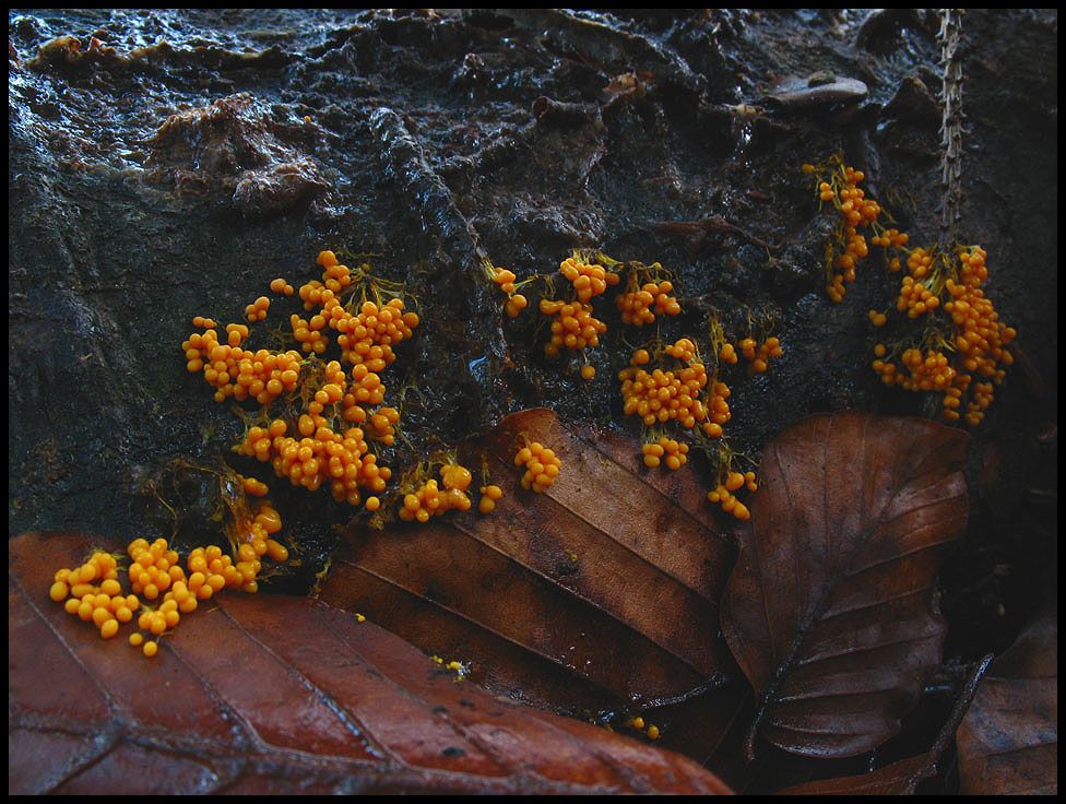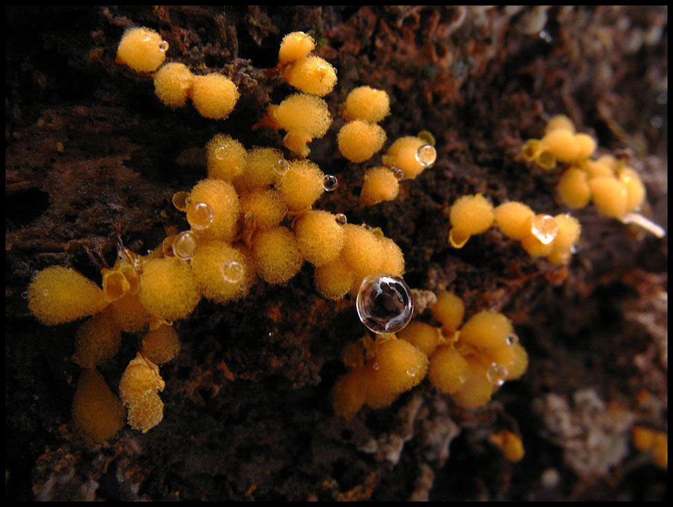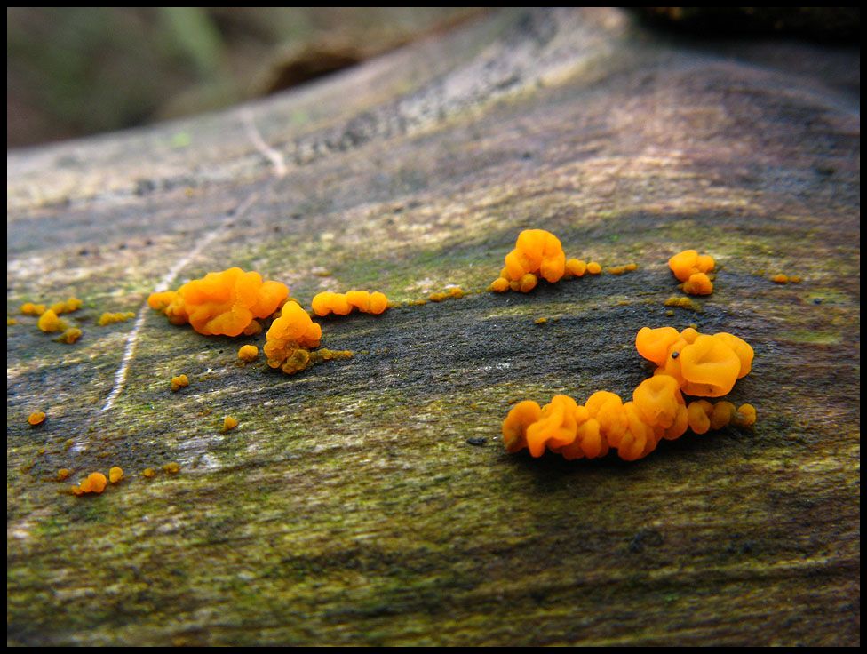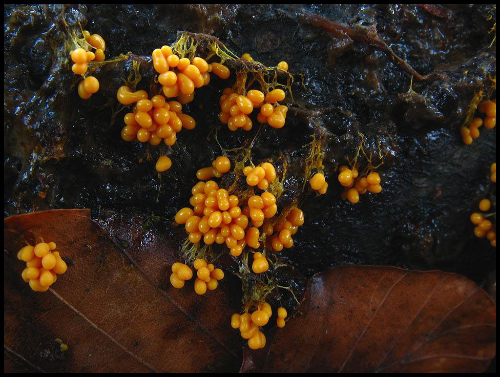 Gelblich orange, nicht wirklich groß und auch tränig präsentiert sich dieser Schleimpilz, dessen Verwandte in der näheren Umgebung etliche Bäume überziehen.