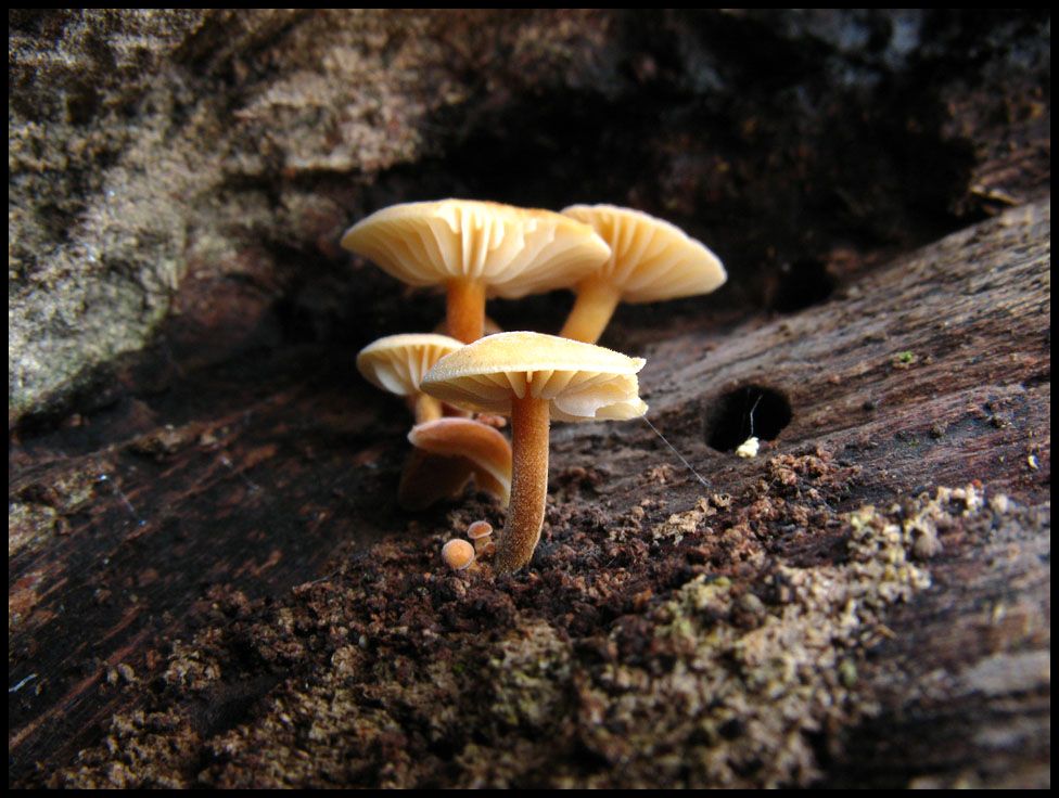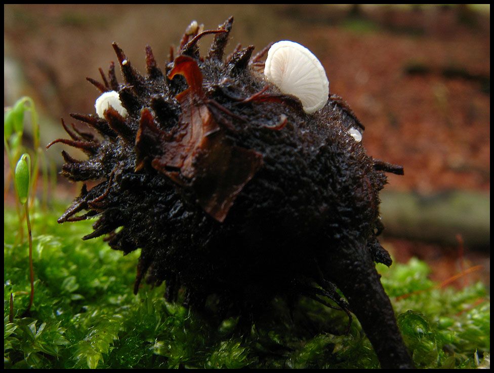 Bei zweien der nächsten drei Bucheckernbewohner, weiß ich wieder wo's ungefähr langgeht. Stummelfüßchen (Crepidotus spec.) und Trompetenschnitzling (Tubaria spec.) hatten sich hier ein zu Hause gesucht. Beim dritten Bild muss ich mich dann fragen, ob Bucheckernfruchtbecher keimen können oder ob sich dort ein Pilz die Ehre gibt?