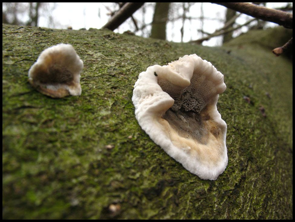 Zwei Pilze die wussten, was übers Wochenende bei uns in Vollendung über das Land kommen würde - sonst hätten sie ja nicht Winterporlinge (Polyporus brumalis) geheißen.