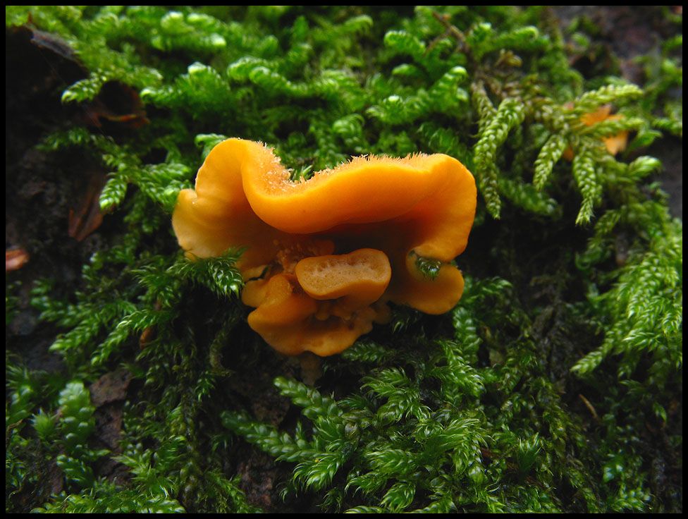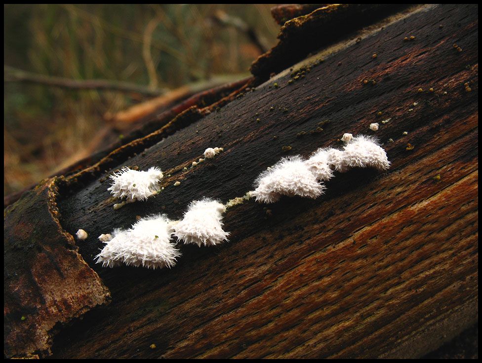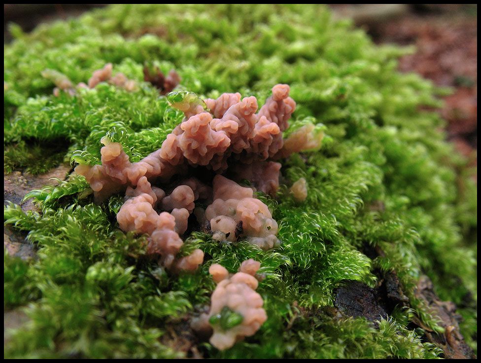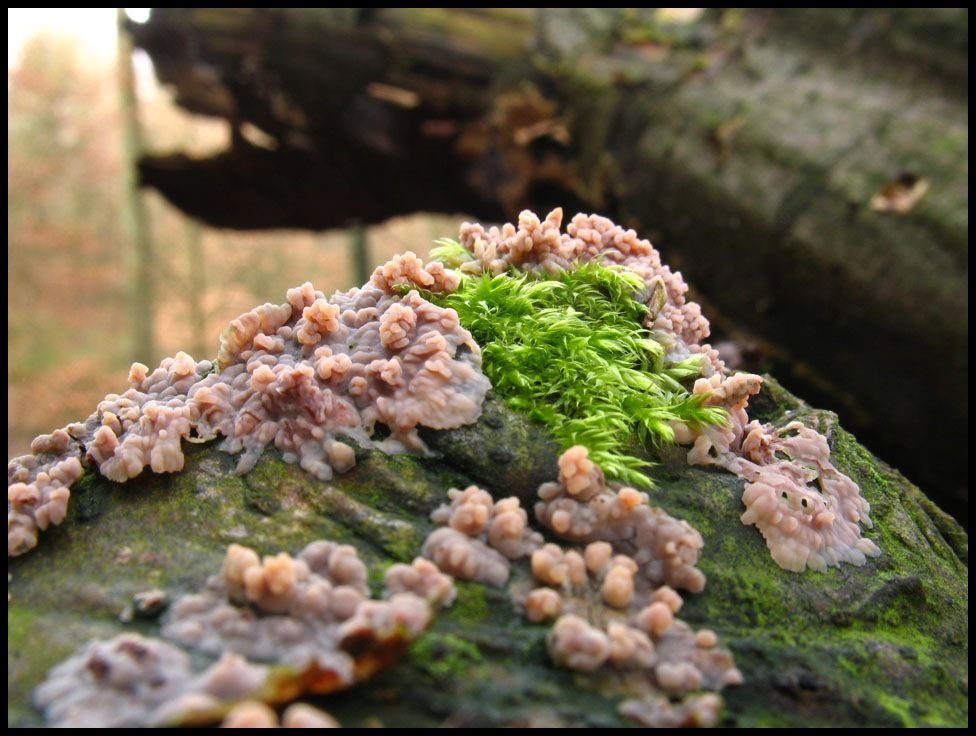 Vom Flauschigen gehen wir jetzt zum Glibbrigen über, denn davon gibt es derzeit reichlich zu sehen. Aber auch hier greife ich ertmal auf einen Pilz zurück den ich bisher nur als hässlichen Belag auf totem Holz angesehen habe. Ansehnlich wird es allerdings, wenn er sich mit Moosen anlegt.
