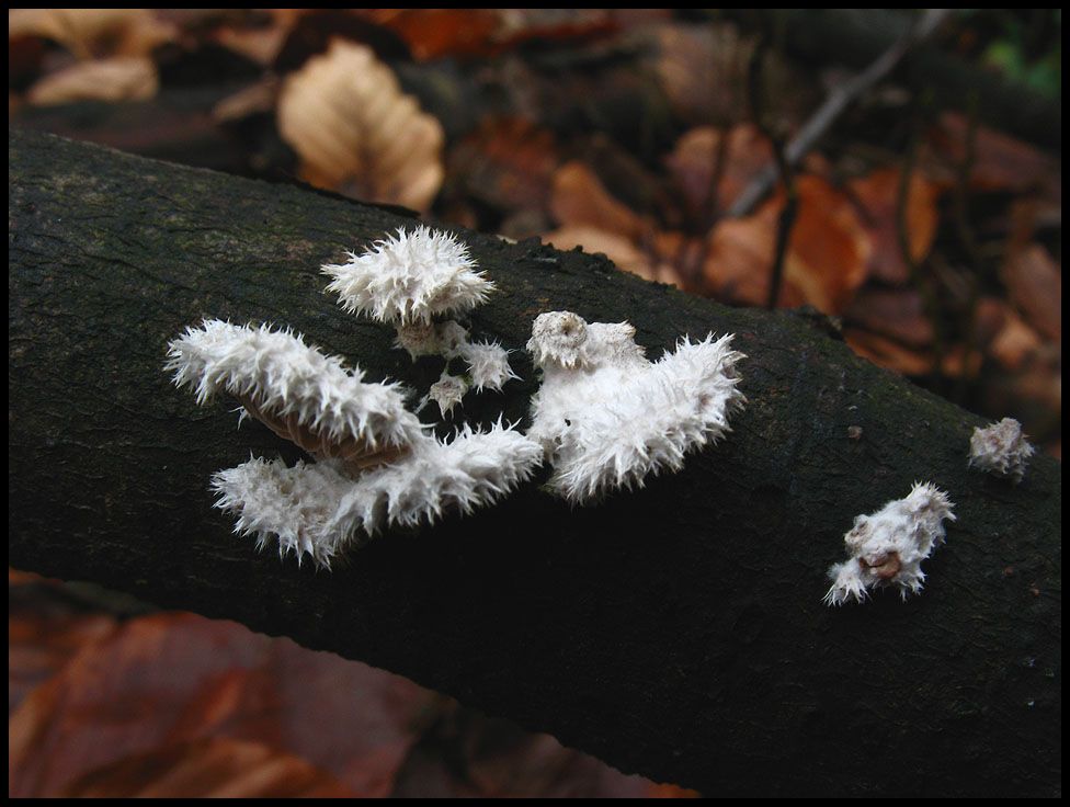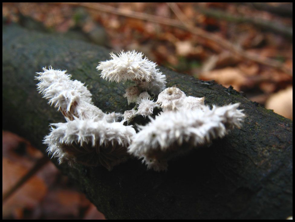 Da wir eben schon den Zottigen Schichtpilz hatten, hier ein paar Weitere die das Attribut zottig durchaus auch im Namen führen könnten. Stattdessen heißen sie aber Gemeine Spaltblättlinge (Schizophyllum commune), obwohl sie eher kuschelig als gemein aussehen