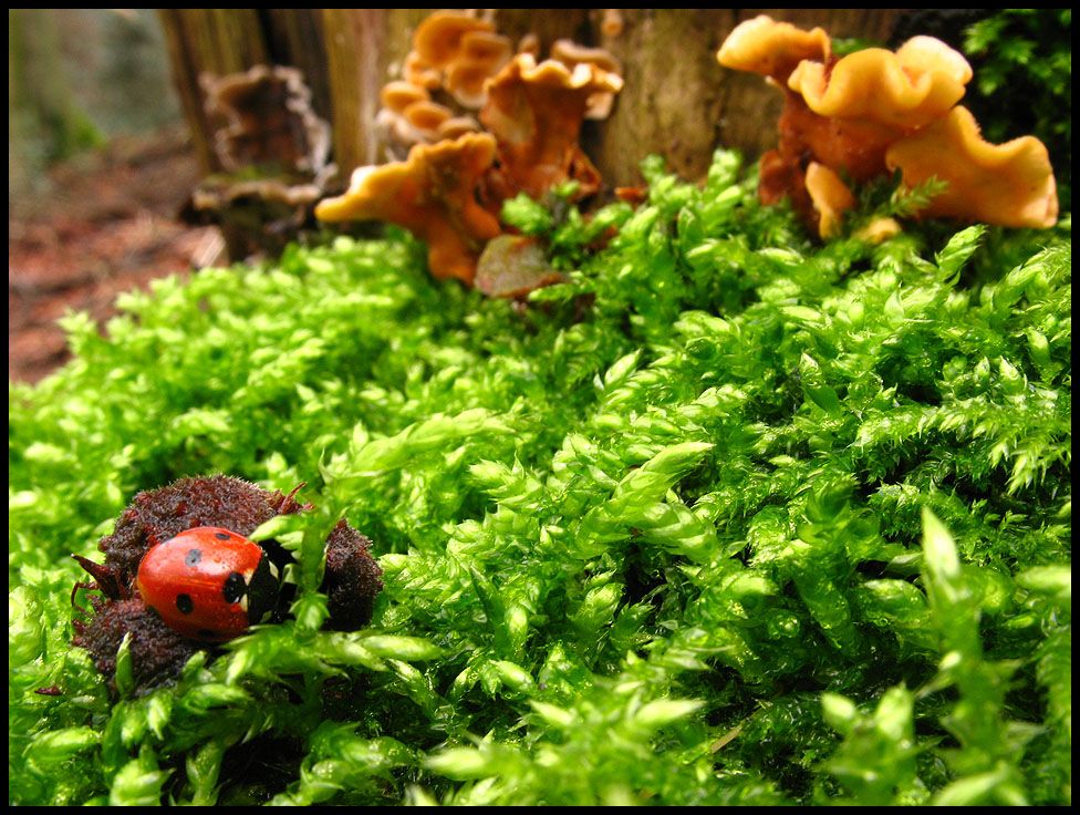 Fangen wir mit dem an, was ich lapidar als 'Baumpilz' abtun würde und wofür ich mich sonst eigentlich nicht wirklich interessiere. Aber bei der zur Zeit mageren Auswahl und den teilweise recht netten Erscheinungsbildern, habe ich doch mal ein paar von ihnen abgeschossen. Bei diesem Leuchtfeuer abgestorbener Hölzer handelt es sich um Striegelige, Zottige oder auch Gelbe Schichtpilze (Stereum hirsutum). Der Marienkäfer saß dort übrigens freiwillig herum und wurde nicht von mir in Position geschoben - was auch für seinen gelben Freund galt, der sich dort noch im Moos versteckte.
