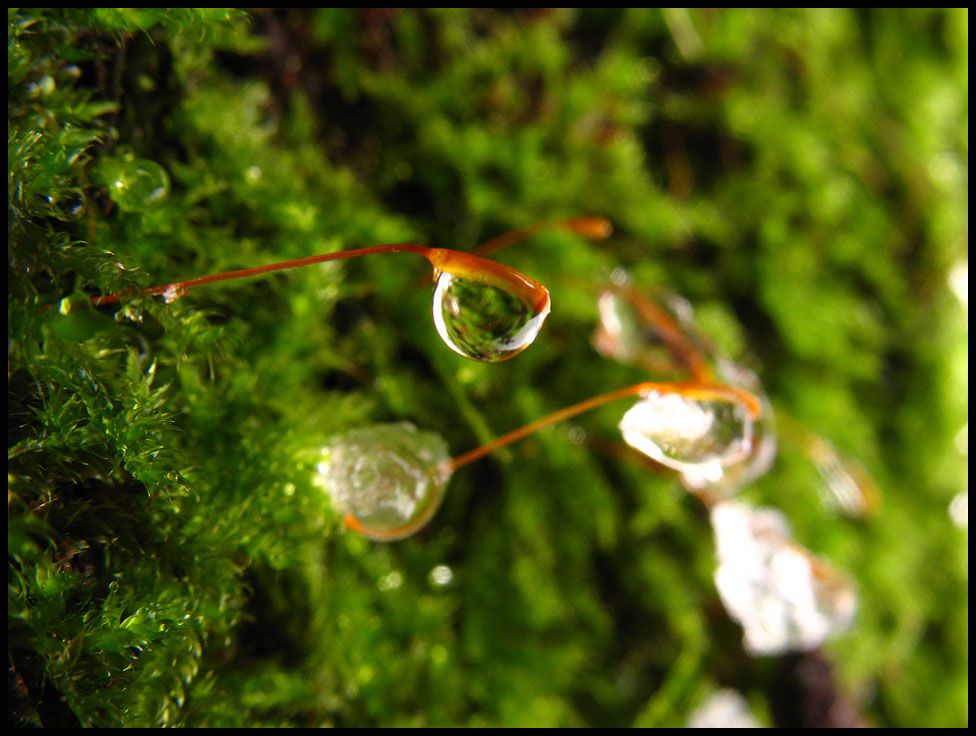 Fange ich da an, wo ich letztes Wochenende aufgehört habe. Wie ich inzwischen dank Gernot weiß, handelt es sich bei Nummer 1 um den Orangeroten Kammpilz (Phlebia radiata), dessen Überlagerung sich hier eine moosige Insel standhaft zur Wehr setzt. Nummer 2 zeigt einen Schleimpilz von dem ich vor Ort annahm, dass er diesen Namen auch zurecht trüge. Erst am PC stellte ich dann fest, dass die Tropfen alles andere als schleimig waren.