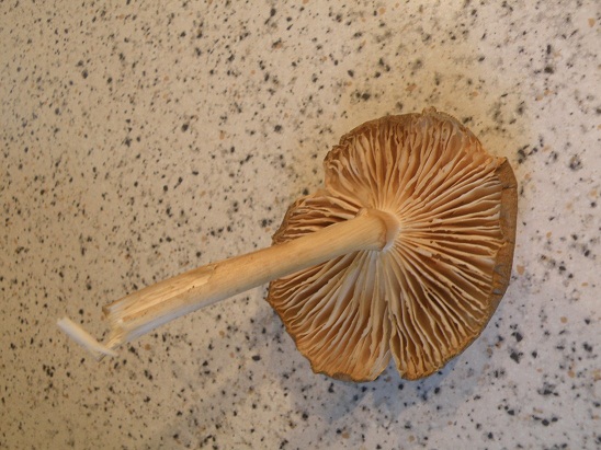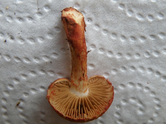 Hut leicht schmierig und Farbe genauso braun wie die Lamellen - sofortiger und zahlreicher Milchaustritt beim Zerbrechen der Lamellen.