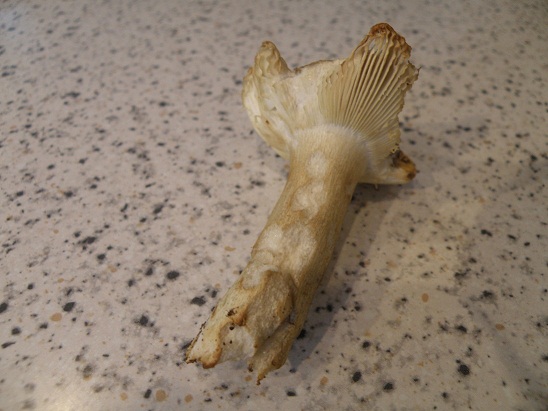wuchs ebenfalls auf einem bemoosten Baumstumpf mit weiteren Exemplaren in der unmittelbaren Umgebung. gesamter Fruchtkörper ca. 10cm hoch und auch der Hut-Durchmesser liegt bei ca. 10cm. Hut-Oberfläche sehr schmierig - keinerlei Verfärbung bei Druck. Die Lamellen verkleben leicht miteinander wenn man sie drückt - kein Austritt von Milch - sehr angenehmer Geruch.