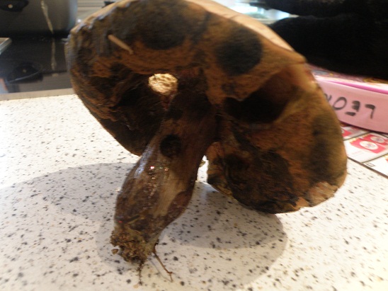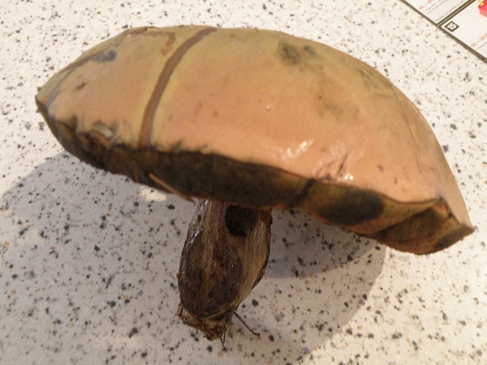 gesamter Fruchkörper ca. 10cm lang, Hut Durchmesser ebenfalls. Hutfarbe: hellbraun, keinerlei Verfärbung bei Druck, relativ große Röhren, sowohl die Röhren als auch das Fleisch selbst sehr fest und wohlriechend.