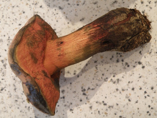 Vor allem ist er schön groß, Hut ca. 15 cm Durchmesser. Ich trau mich jetzt als Anfänger auch mal einfach "Maronen-Röhrling" zu sagen, die Röhren liessen sich relativ leicht abtrennen und darin fand sich auch allerlei Getier.