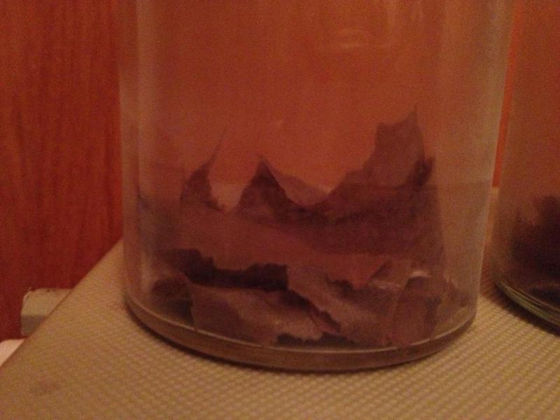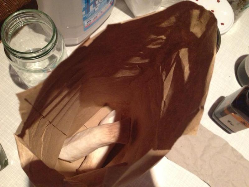 schüttels gut ab so dass es nicht mehr klatsch nass is und tropft. zereiß das papier oder die pappe in so große stücke, dass sie problemlos ins glas passen. leg eine schicht direkt auf den glasboden und dann den pilz drauf.