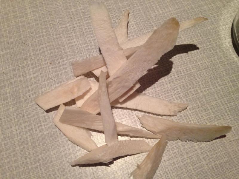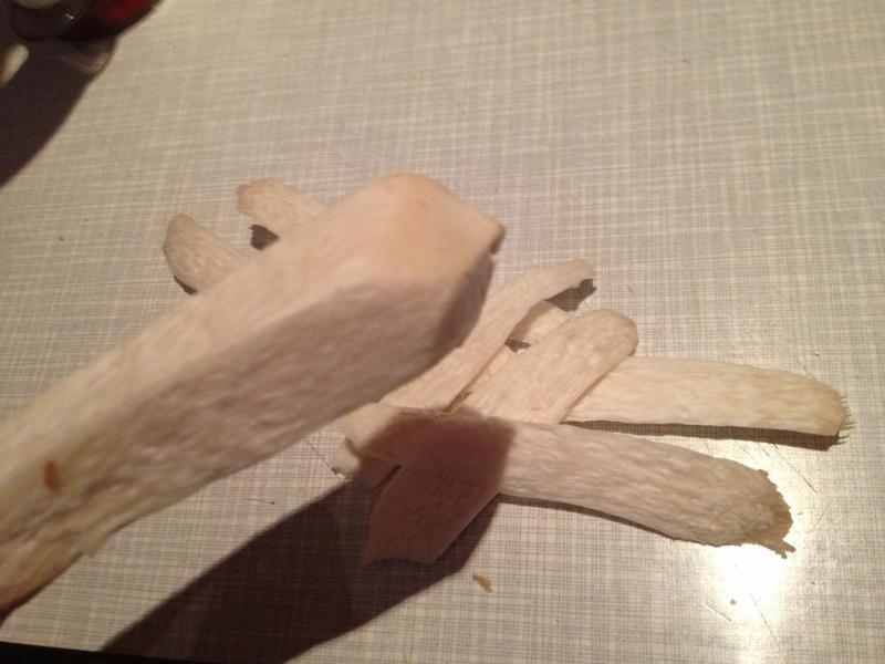 den pilz in kleine stücke schneiden. am besten scheiben mit ca. 3-5 cm länge, 1-1,5cm breite und 3 mm dicke. (hat sich bei mir am besten bewehrt bei austerpilzen)