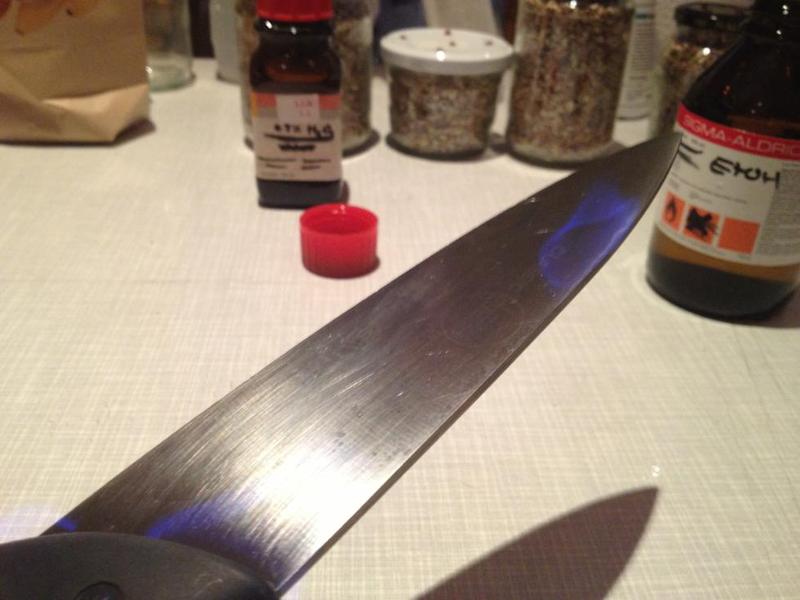 man kann auch genauso gut nen kampingkocher nehmen und die klinge erhitzen.