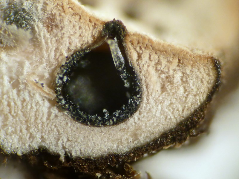 Fruchtkörper ein kissenförmiges Stroma von 4-6mm Breite, darin eingesenkt befinden sich 0,4-0,7mm große, schwarze Perithezien, welche durch schwarze, etwas hervorragende Mündungen auf der weißen Stromaoberfläche sichtbar sind; Stroma außen dunkelbraun bis schwarzbraun, innen weiß, von biegsamer Konsistenz, ohen deutlichen Stiel direkt dem Substrat aufsitzend oder etwas eingesenkt.