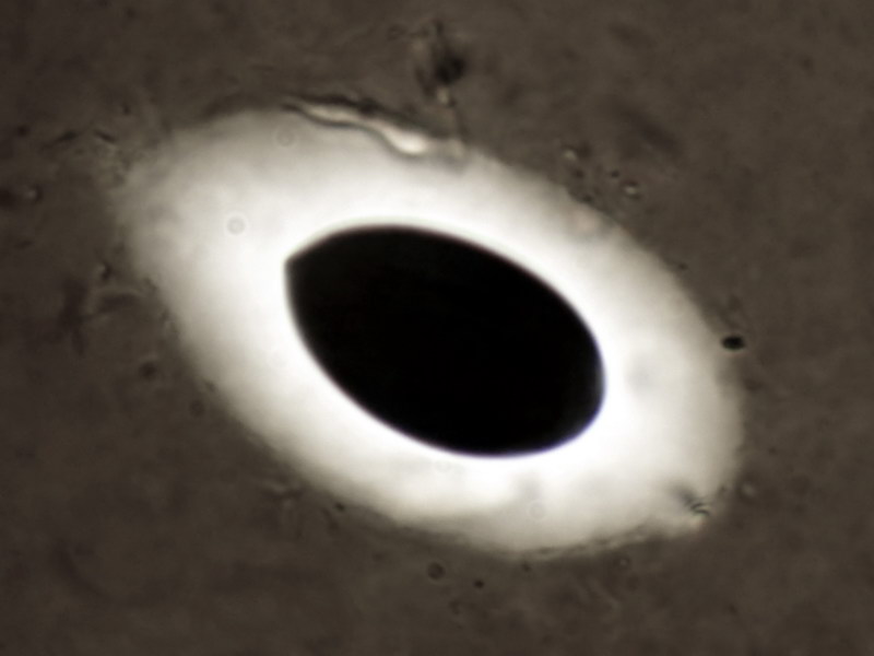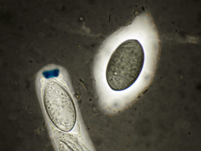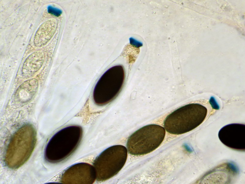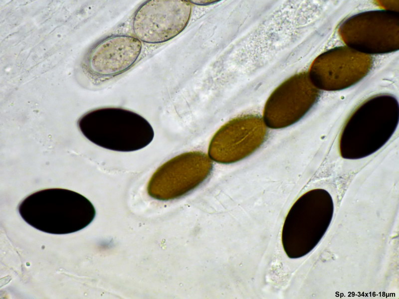 Sporen 29-34x16-18 µm, elliptisch mit leicht zuspitzenden Enden, glatt, jung hyalin, dann grünlich, dann schwarz, mit unvollständig durchgehender Keimspalte, mit bis zu 10 µm dicker Schleimhülle, die zu den Polen hin zipfelartig zuspitzt. Asci 200-240x20-25 µm, 8sporig, zylindrisch, kurzstielig, Sporen uniseriat, auf Lugol (IKI) positiv (blau) reagierend, Apikalapparat umgedreht trapezförmig, etwa bis 3-4 µm hoch und 5-7 µm breit.