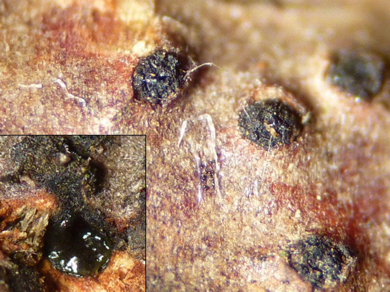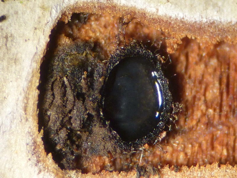 Fruchtkörper ein Perithezium von etwa 0,8-1,2 mm Breite, kugelig bis flach linsenförmig, recht variabel in der Form, außen von einem dichten Hyphenfilz umgeben, der sich oft weitläuftig zwischen Holz und Rinde ausbreitet, innen schwarz und glänzend.