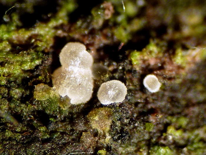 Lachnum rhytismatis, an Ahornblättern im Frühjahr