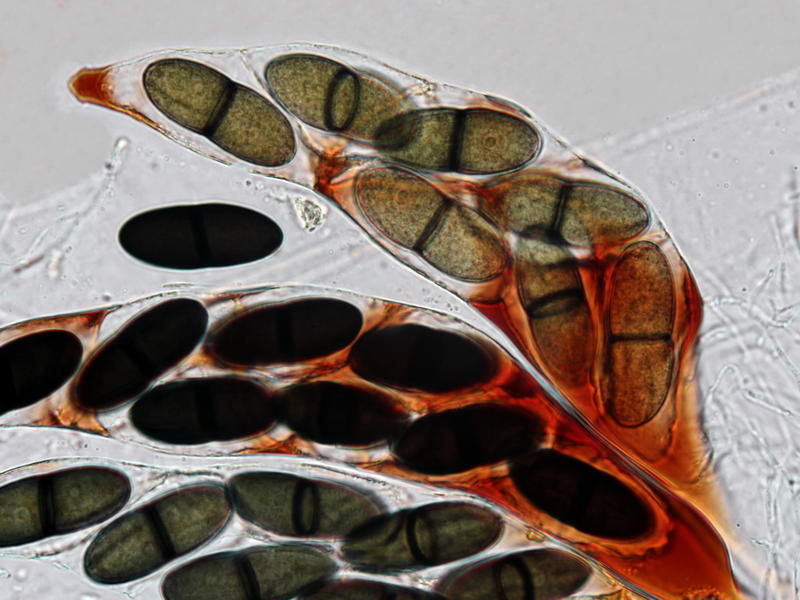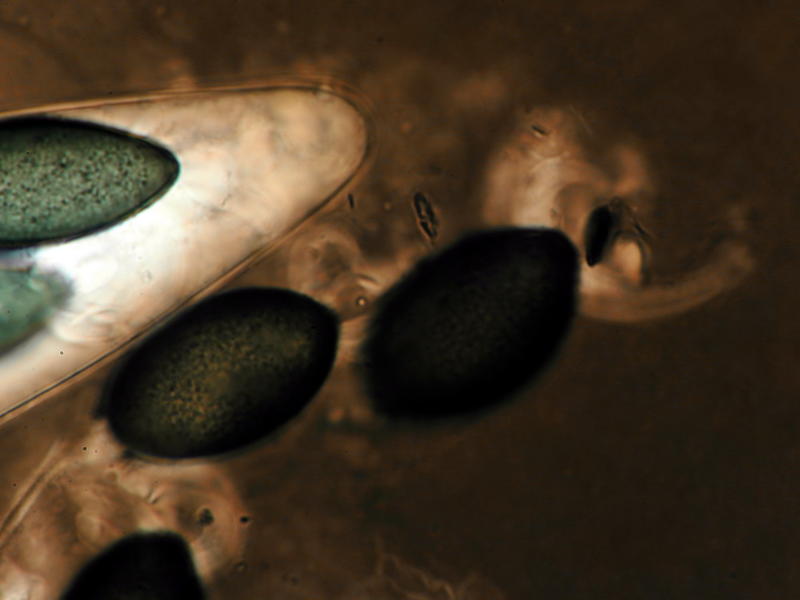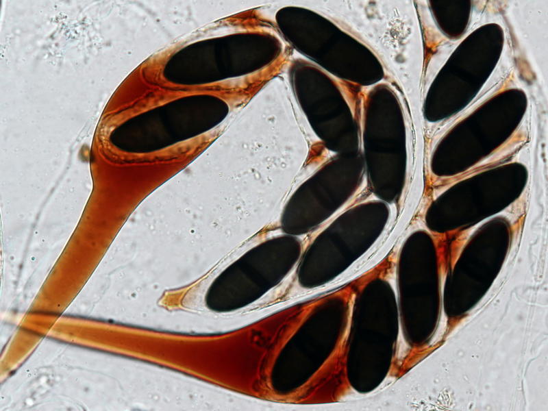 Typisch ist auch die folgende Art, Coniochaeta scatigena. Bei der Sordariomycetes-Gattung handelt es sich um Dung- und Holzbewohner mit dunklen Sporen, die mehr oder weniger deutlich seitlich abgeflacht und daher besonders bei dieser Art wie Münzen aussehen (sofern sie halbschräg im Ascus liegen, sieht man das auch gut). Coniochaeta, da steckt der Wortteil "chaeta" drin = haarig, mit Seten besetzt, ist makroskopisch durchaus schon anhand der stacheligen Perithezien ansprechbar. Die Perithezien selber sind kugelig, im Gegensatz zu den konischen oder pyramidalen Pseudoperithezien von Trichodelitschia (makroskopische Ähnlichkeit aufgrund ebenfalls vorhandener Seten).
