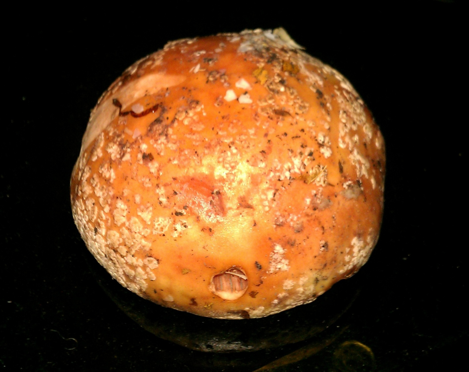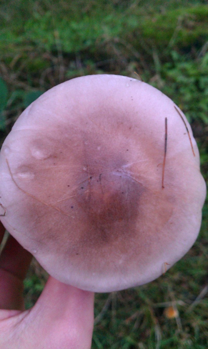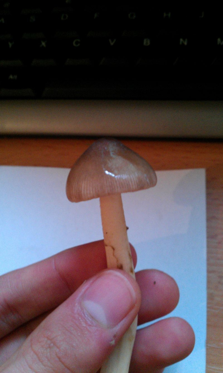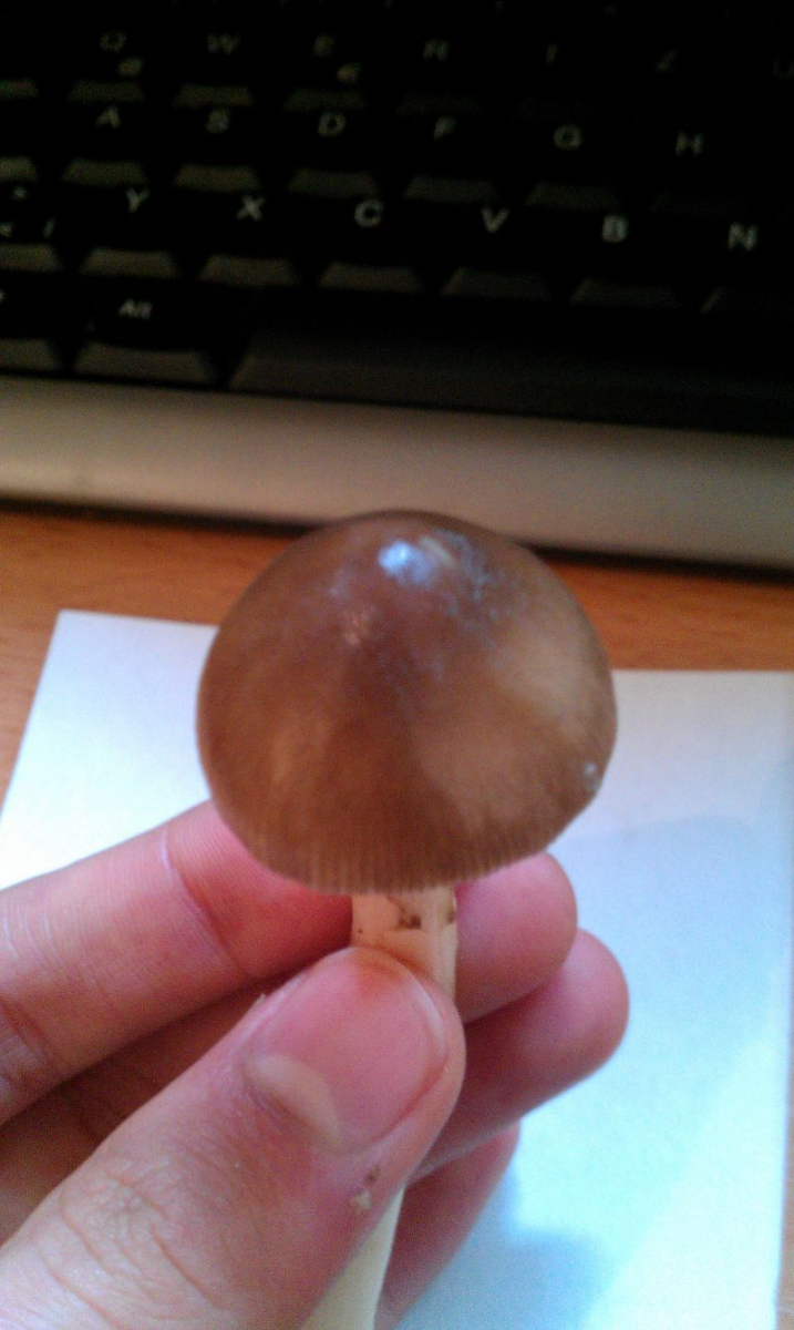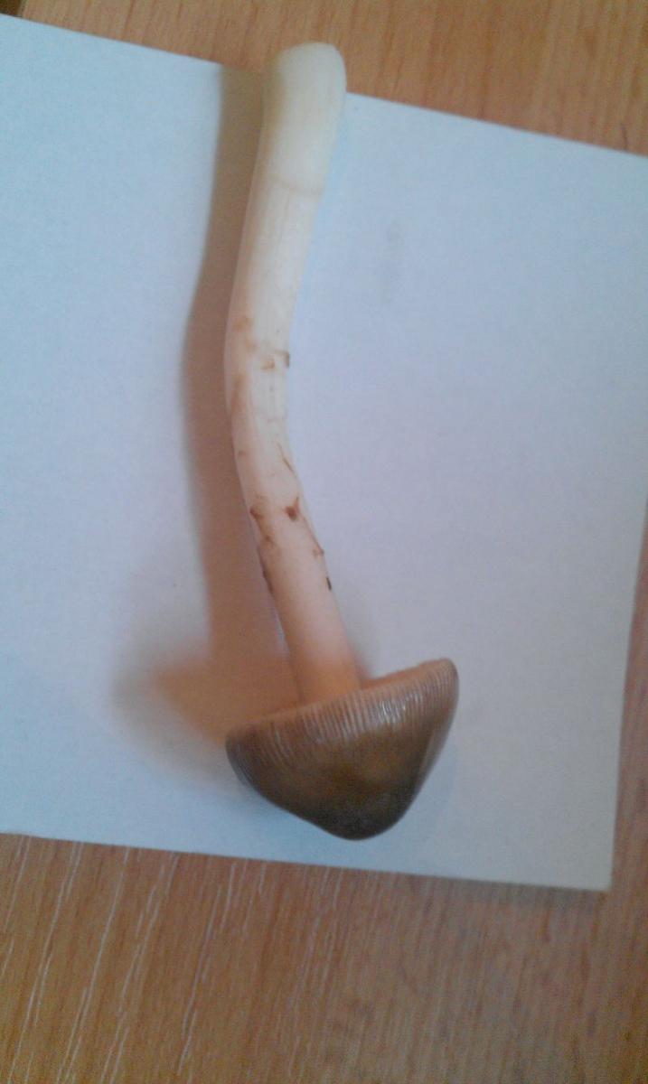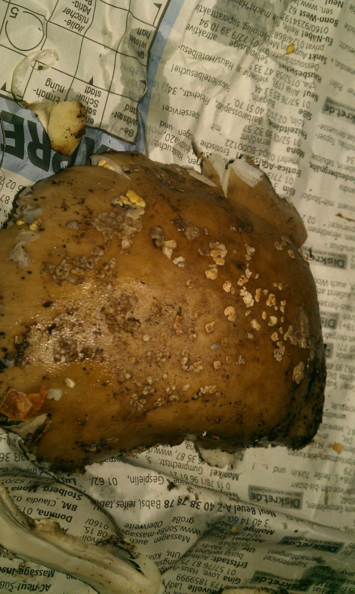 Hut: Länge: etwa 8 cm; Haut grau-silber (leicht glänzend) mit braunem Unterton. Weiße Flecken (Velum reste vorhanden); Haut ist abziehbar, dies ist jedoch nicht ganz einfach; Oberfläche ist einwenig schmierig und weist beim drücken Druckstellen auf. Unterhalb der abgezogenen Haut, ist weißes Fruchtfleisch zu erkennen. Zur Mitte hin wird es jedoch leicht grau-silber bräunlich. Die schicht des Fruchtfleisches ist maximal etwa 1- 1,5 cm groß und wird zu den Rändern konstant kleiner. (auch weiß!)