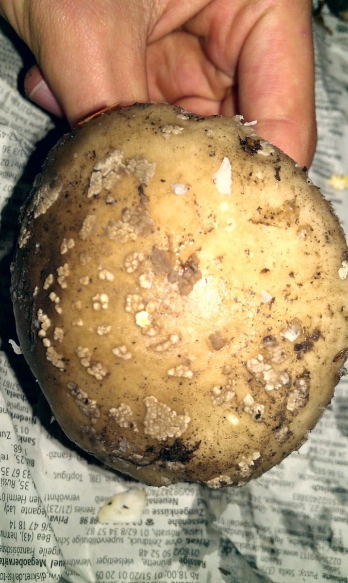 Ich hoffe sehr, dass meine Angaben genügen, um diesen Pilz zu bestimmen. Meine Vermutung: Grauer Wulstling, Pantherpilz, evtl. Königsfliegenpilz, (?)