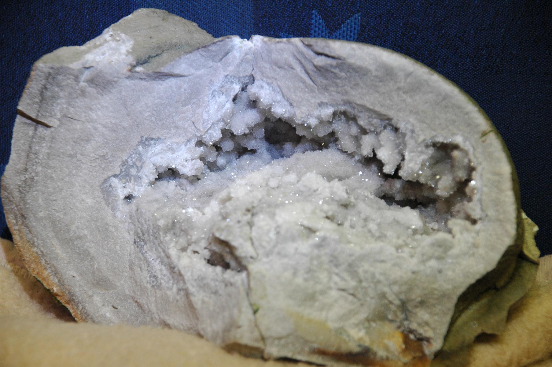 ja nach mehrere fehlgeschlagenen versuche, die geode zu teilen, vorsichtig schlitz schlagen, damit sie möglichst mittig bricht, stellte sich als sehr schwierig dar und ich gab auf. heut kam dann die blitz-idee, mal mit dem schlegel drauf zu hauen :shy:ja was für ne glorreiche idee