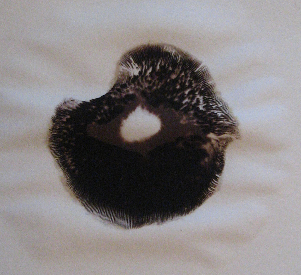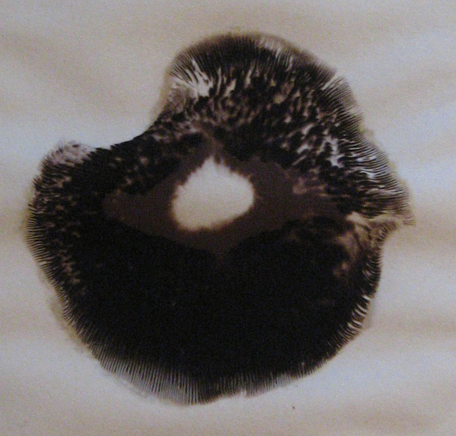 ich habe jetzt mal die Sporenprobe über Nacht gemacht, war glaub ich ein bisschen lang, da sie an einigen Stellen doch recht dunkel geworden ist. Den Hut hab ich auch grad mal angeknabbert, pfuideibel war das bitter...