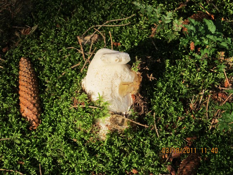 gebe aber zu bedenken der vermeitliche Stiel doch so stark wie mein Unterarm war (siehe als Vergleich den Tannenzapfen neben dem Pilz) und das ganze Gebilde augenscheinlich Unbeschädigt war,also kein abgebrochener Kopf.Der Pilz war an der Bruchstelle ( Bild 1) ca. 6cm breit und oval.