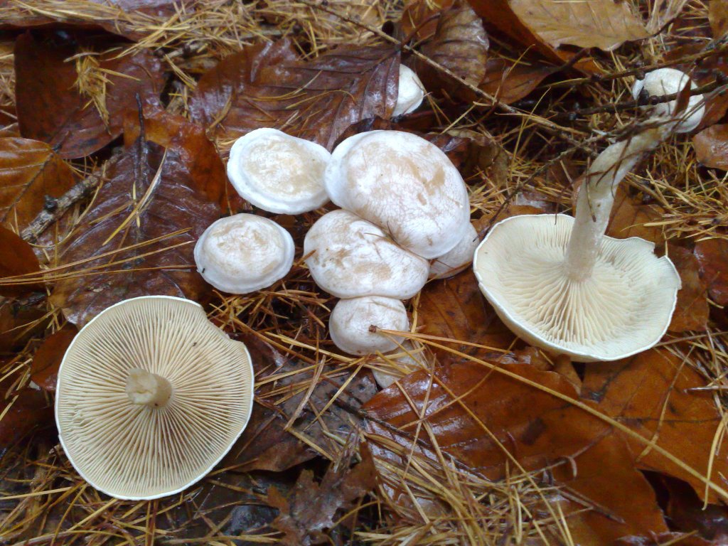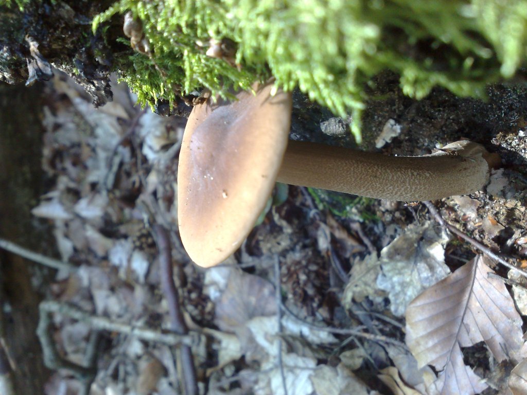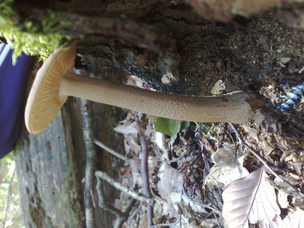 Man kann es zwar kaum (gar nicht?) erkennen, aber der Hut war so gut wie gar nicht grubig, trocken und nach meiner Beurteilung deutlich samtig und nicht seidig matt. Der Stiel hatte diese Natterung, war aber nicht samtig/haarig. Der GRÖGER beschreibt Xerula hygrophoroides, welcher einen genatterten Stiel besitzen soll. Dieser schied u.E. aus, da er nicht wurzelnd sein soll. Der hier gezeigte Stiel war in der gleichen Länge nochmal im Boden. Gegen longipes/pudens sprach