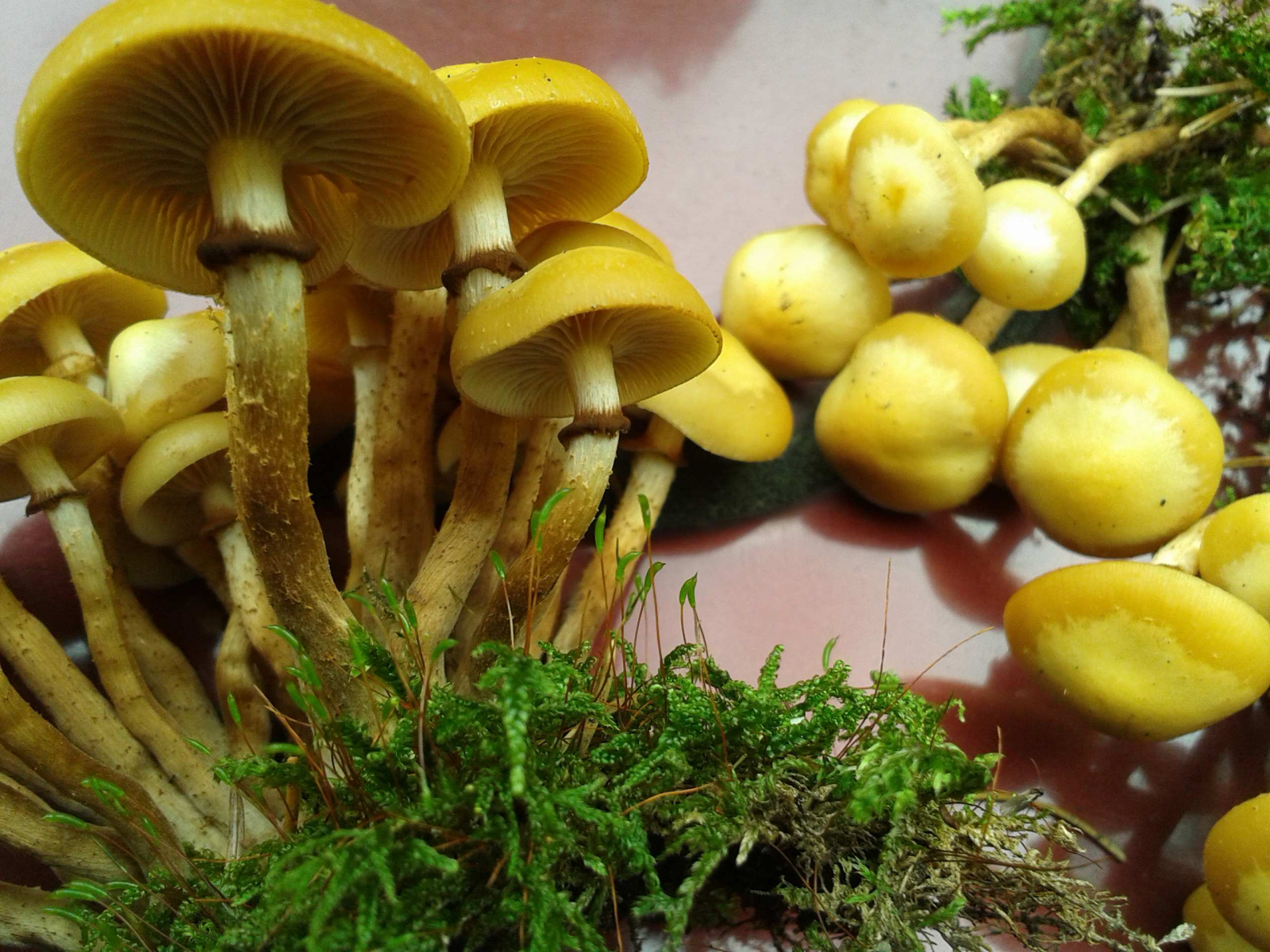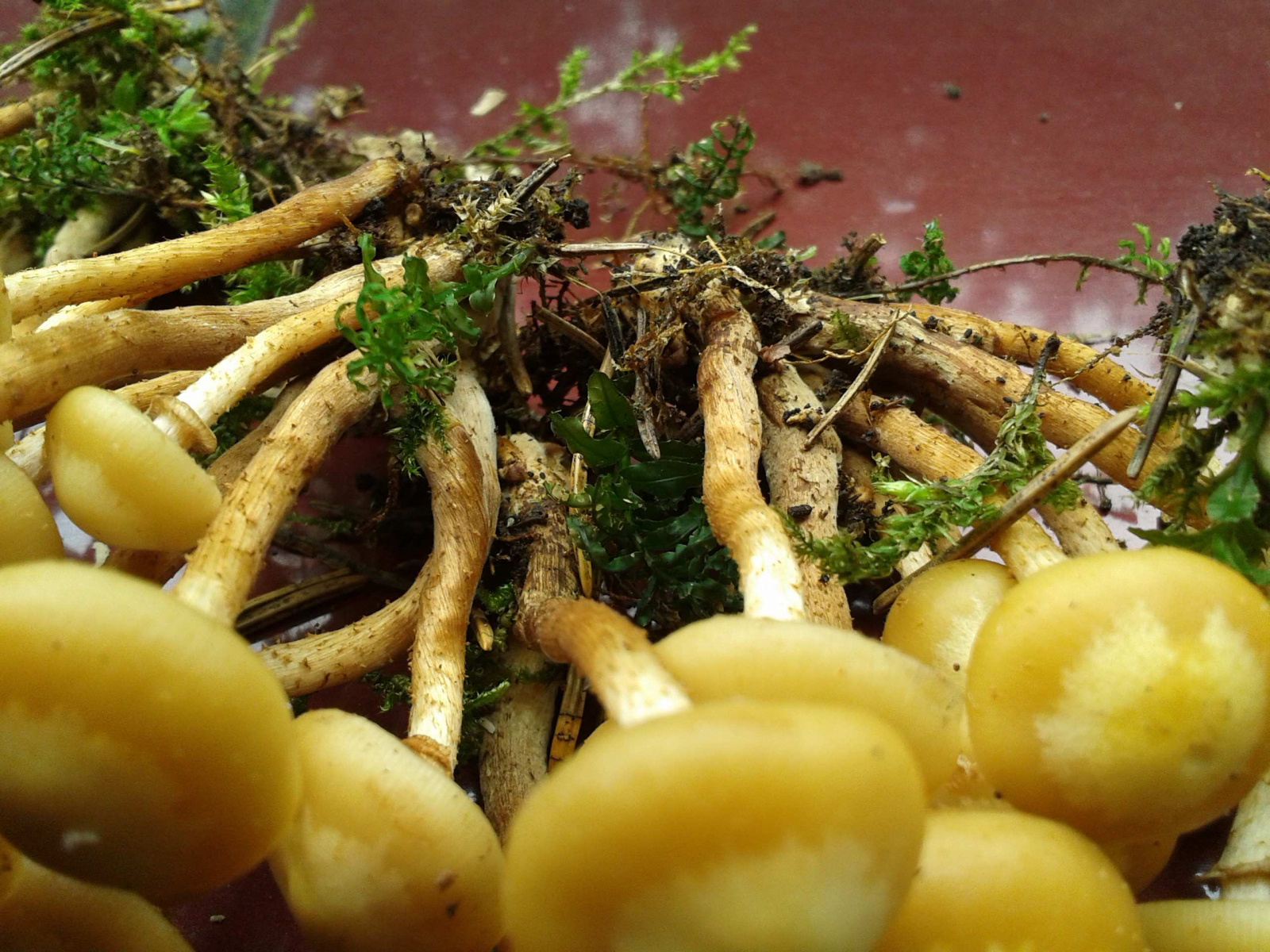 ist ja schon fast peinlich, wenn man mit diesem Thema auftaucht, wo doch schon darüber geschrieben wurde. Aber ich habe mich bislang nicht getraut, derartige Gesellen mitzunehmen. Heute bin ich über einen sehr großen Baumstumpf (wohl Fichte) gestolpert, der über und über mit Grüppchen ganz junger Pilze bewachsen war. Ich habe ein paar Büschel mitsamt Substrat mitgenommen und anschließend frisch abfotografiert - ganz romantisch