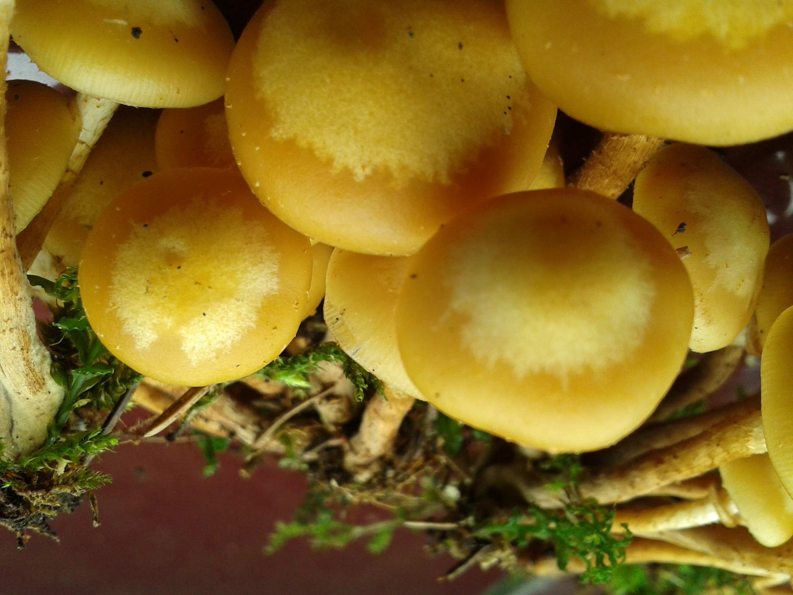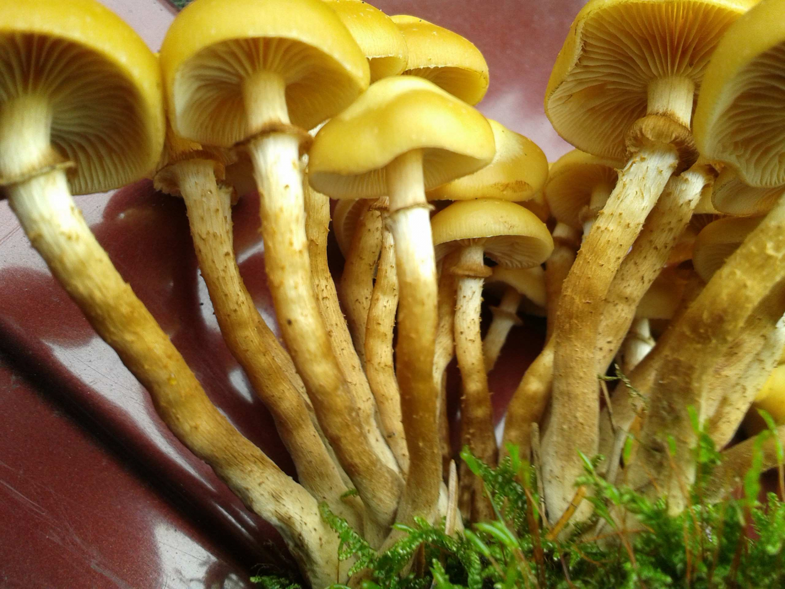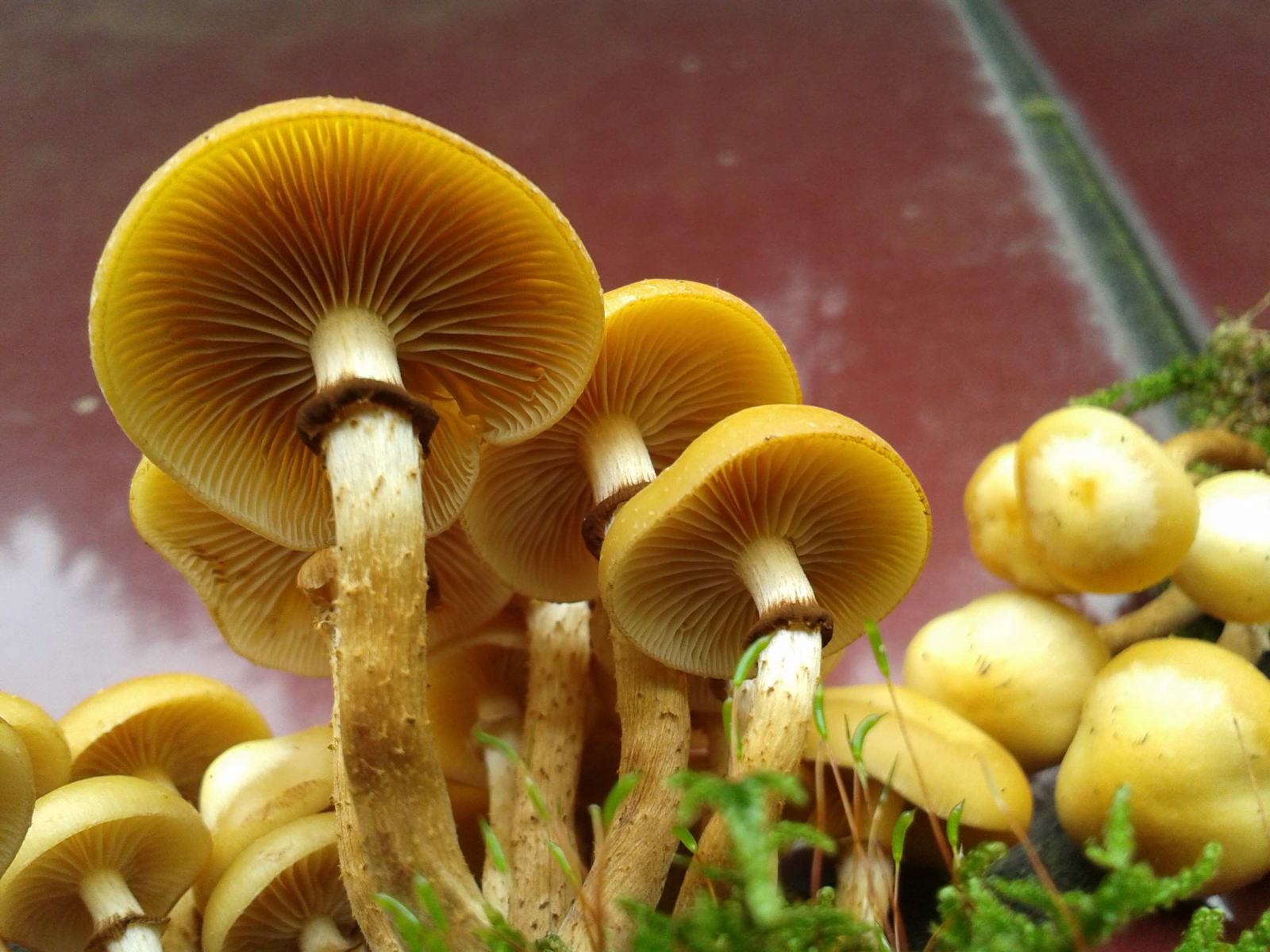 auf dem Autodach, weil da das Licht am besten war. Jetzt hab' ich daheim nochmal alle Literatur studiert, natürlich auch Björns bekannten Thread hier (auf dem aber leider die Bilder nicht mehr zu sehen sind). Also, ich bin mir EIGENTLICH sicher, daß es sich um Stockschwämmchen handelt - der beflockte Stiel unterhalb des Rings, die Tatsache, daß viele der Pilze an der Basis zusammengewachsen sind, daß sie "nach Pilz" riechen und nicht nach Mehl, das alles spricht dafür. Mit viel Phantasie kann man sogar winzige weiße Punkte auf manchen der Hüte und eine Riefung mancher Mini-Manschette erkennen. Trotzdem ist mir die Sache zu heikel - ich würde Euch herzlich bitten, Eure fachkundiges Auge auf meine Bilder zu werfen:Ich bin mir bewußt, daß es hier keine Essensfreigabe gibt